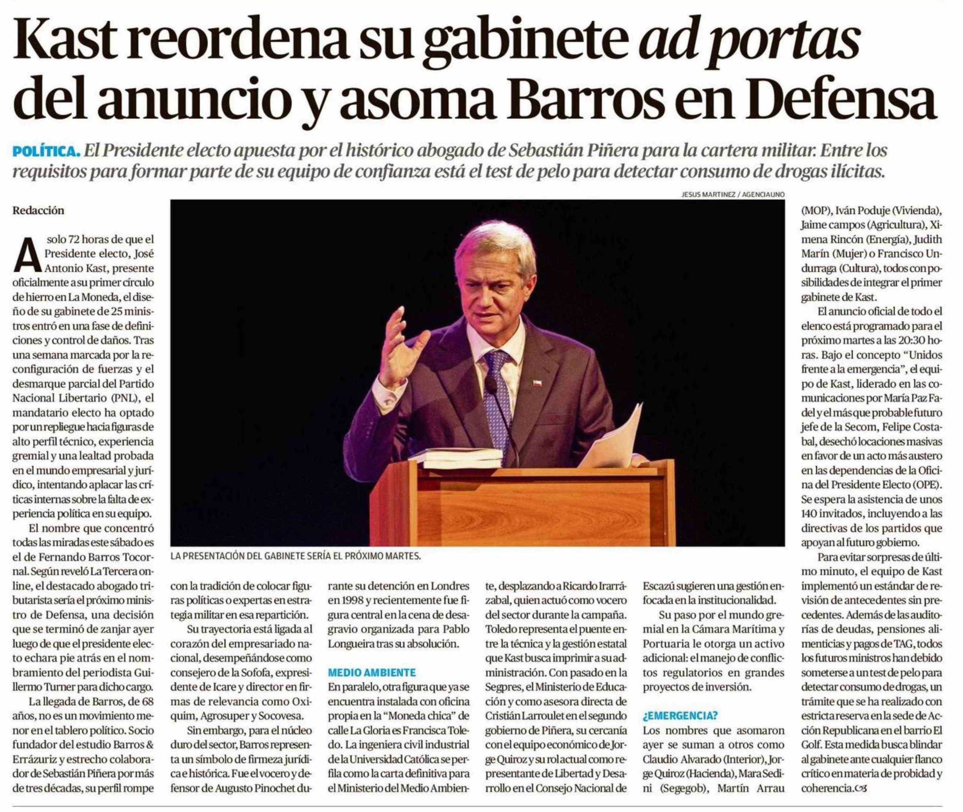 Título: Kast reordena su gabinete ad portas del anuncio y asoma Barros en Defensa