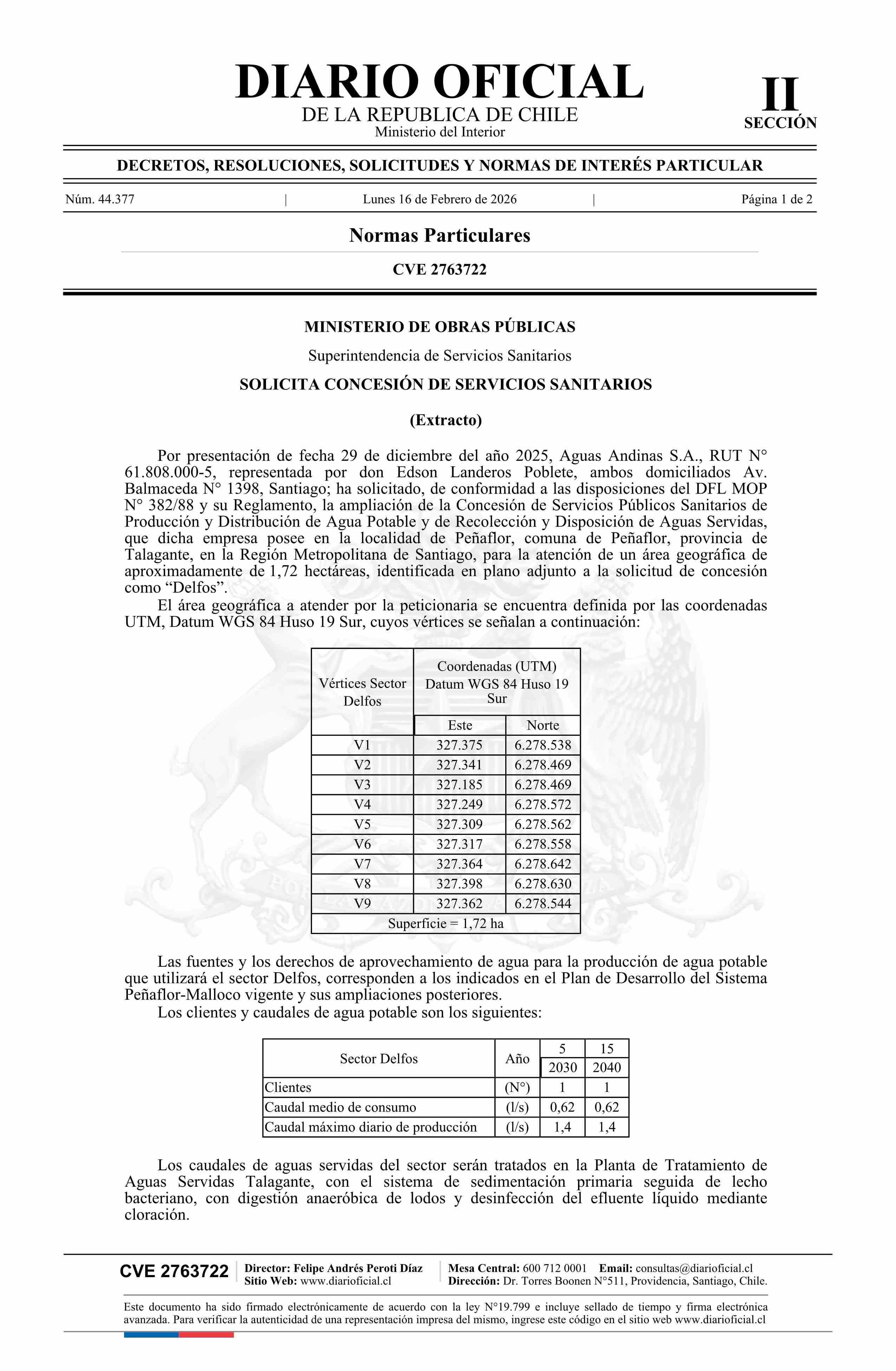 Solicitud de ampliación de concesión de servicios sanitarios de producción y distribución de agua potable y recolección y disposición de aguas servidas en comuna de Peñaflor 16-02-2026 Diario Oficial Edición Electrónica |