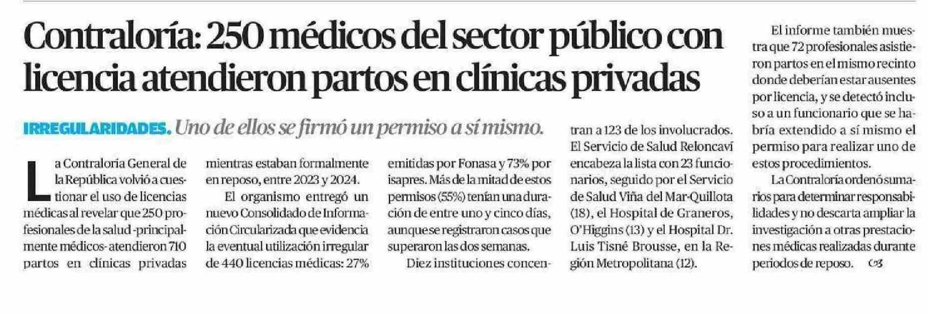 Contraloría: 250 médicos del sector público con licencia atendieron partos en clínicas privadas 24-05-2025 El Mercurio de Calama |