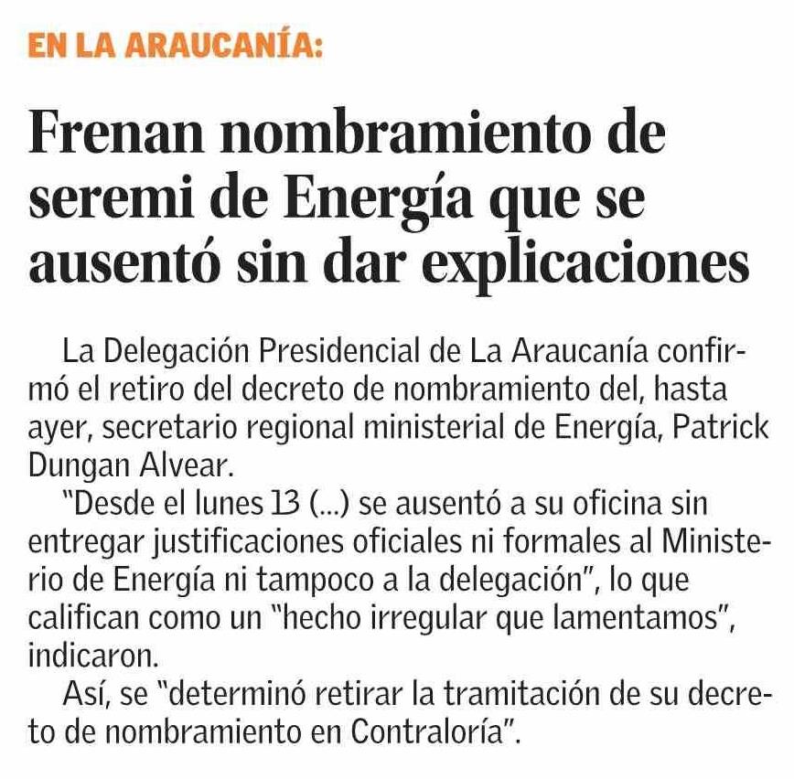 Frenan nombramiento de seremi de Energía que se ausentó sin dar explicaciones 16-04-2026 El Mercurio |