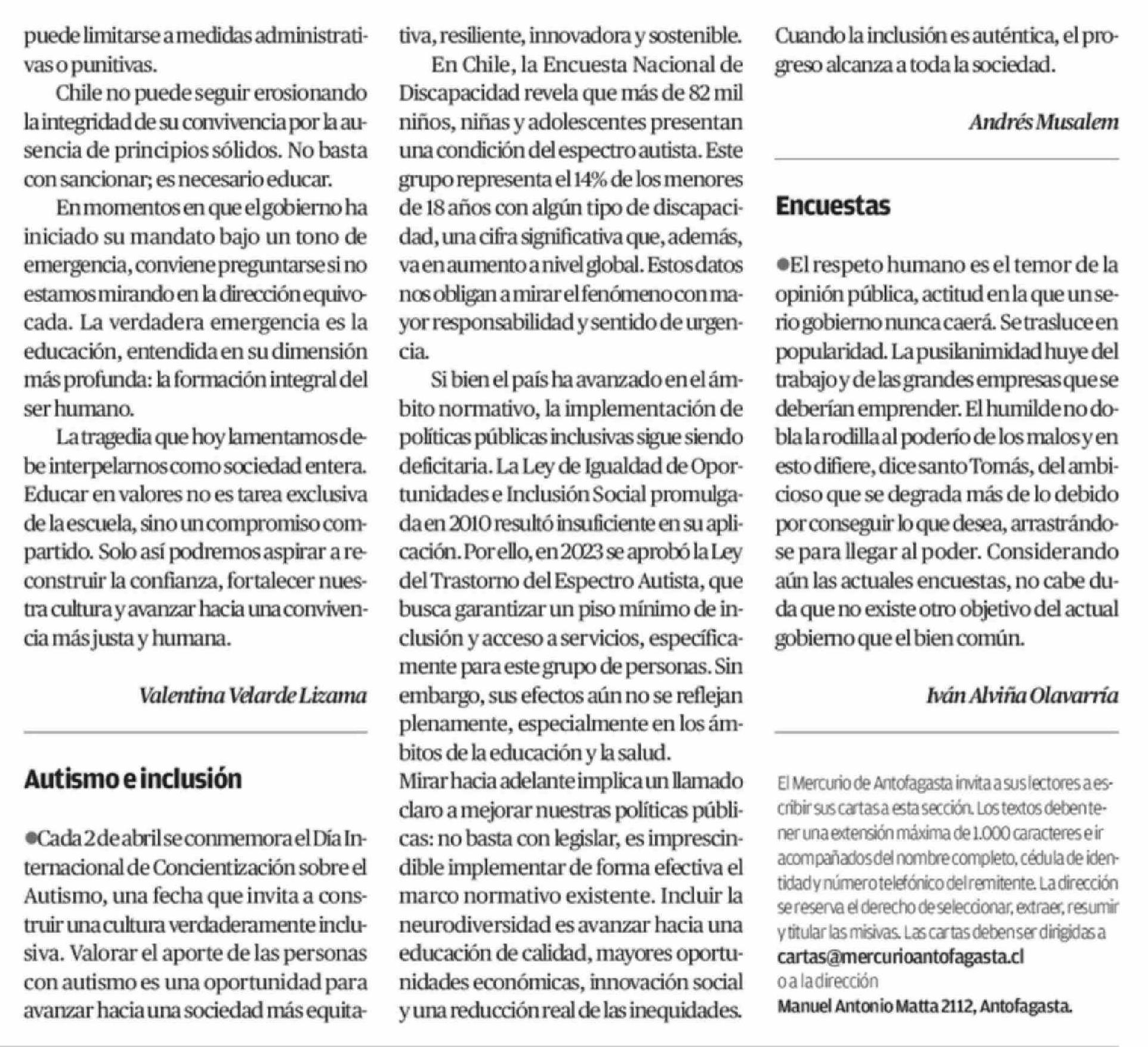 Cartas: Autismo e inclusión 03-04-2026 El Mercurio de Antofagasta |