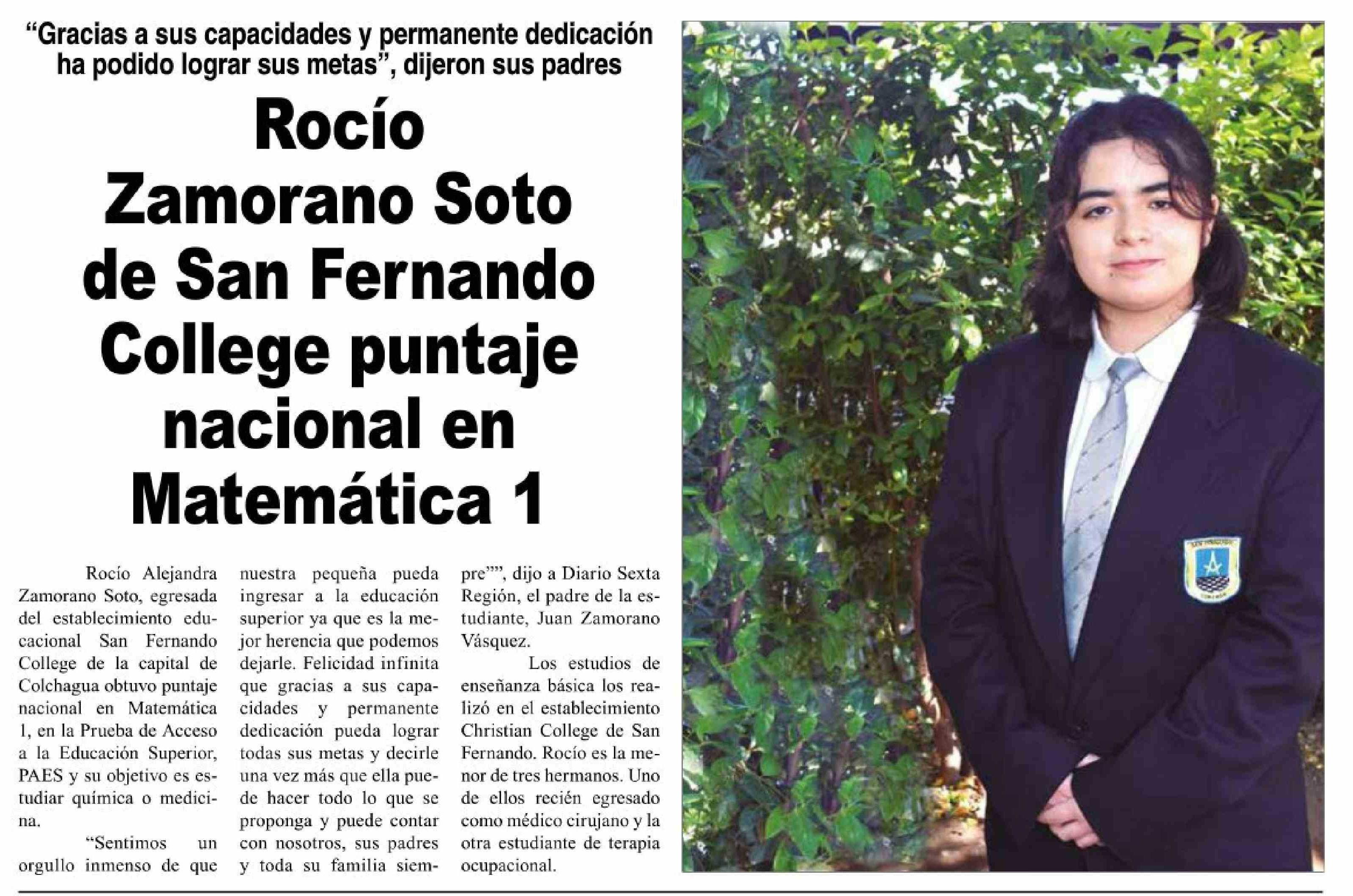 | Título: | Rocío Zamorano Soto de San Fernando College puntaje nacional en Matemática 1 |