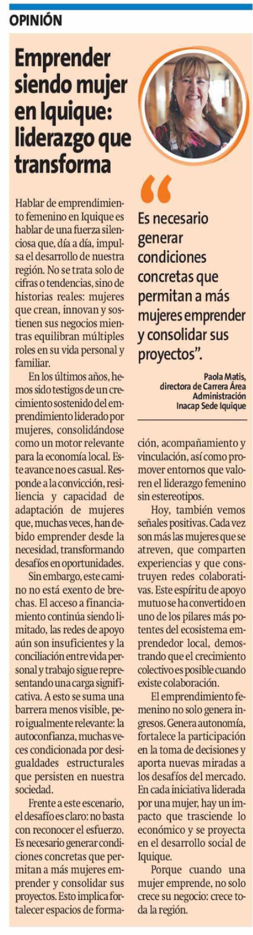 Columnas de Opinión: Emprender siendo mujer en Iquique: liderazgo que transforma 18-04-2026 La Estrella de Iquique |