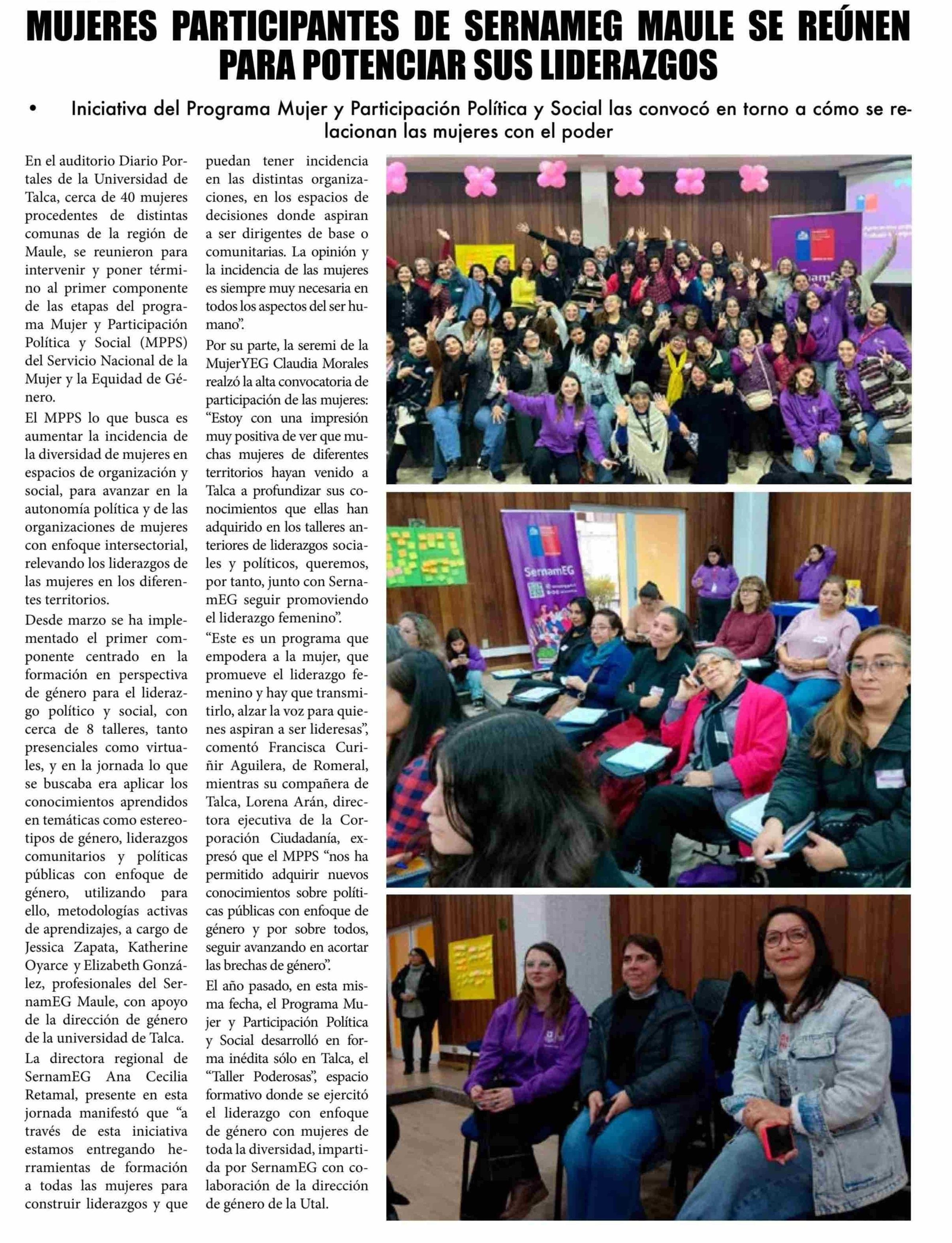 MUJERES PARTICIPANTES DE SERNAMEG MAULE SE REÚNEN PARA POTENCIAR SUS LIDERAZGOS 05-06-2025 El Lector |