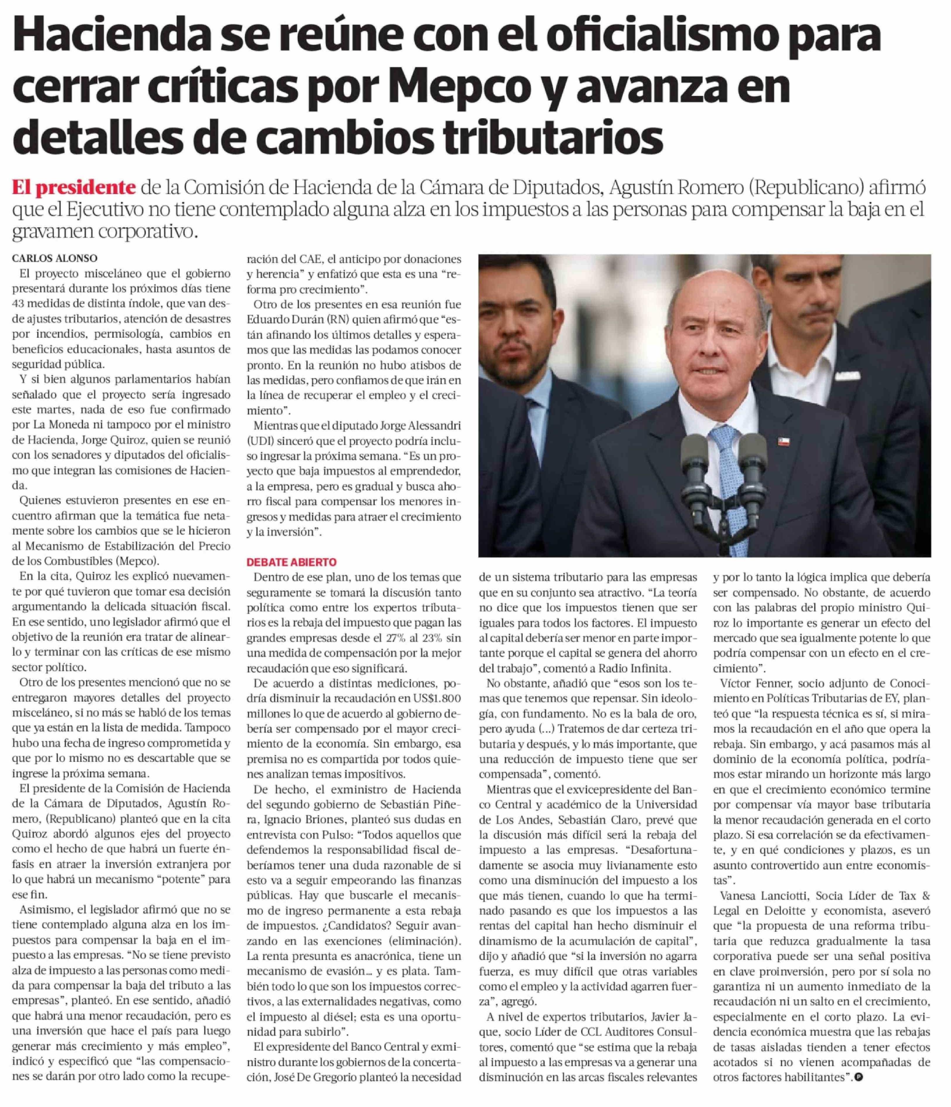Hacienda se reúne con el oficialismo para cerrar críticas por Mepco y avanza en detalles de cambios tributarios 07-04-2026 La Tercera |