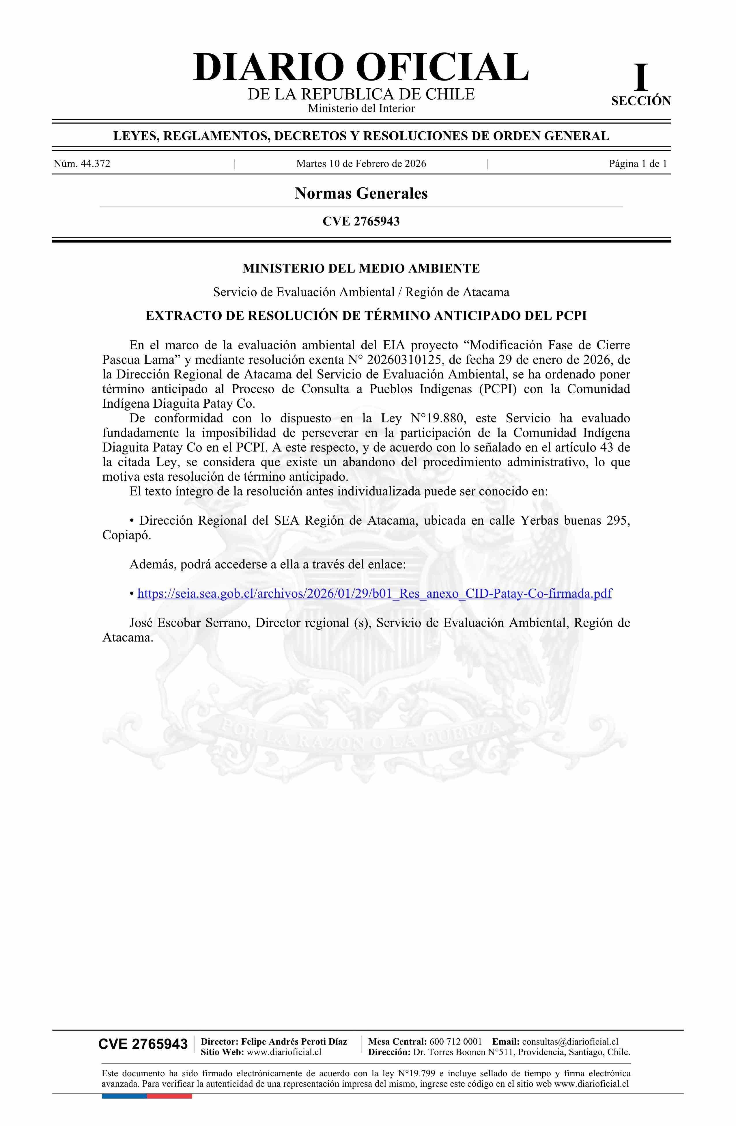 Título: Extracto de resolución exenta número 20260310125, de 2026.- Término anticipado al Proceso de Consulta de Pueblos Indígenas