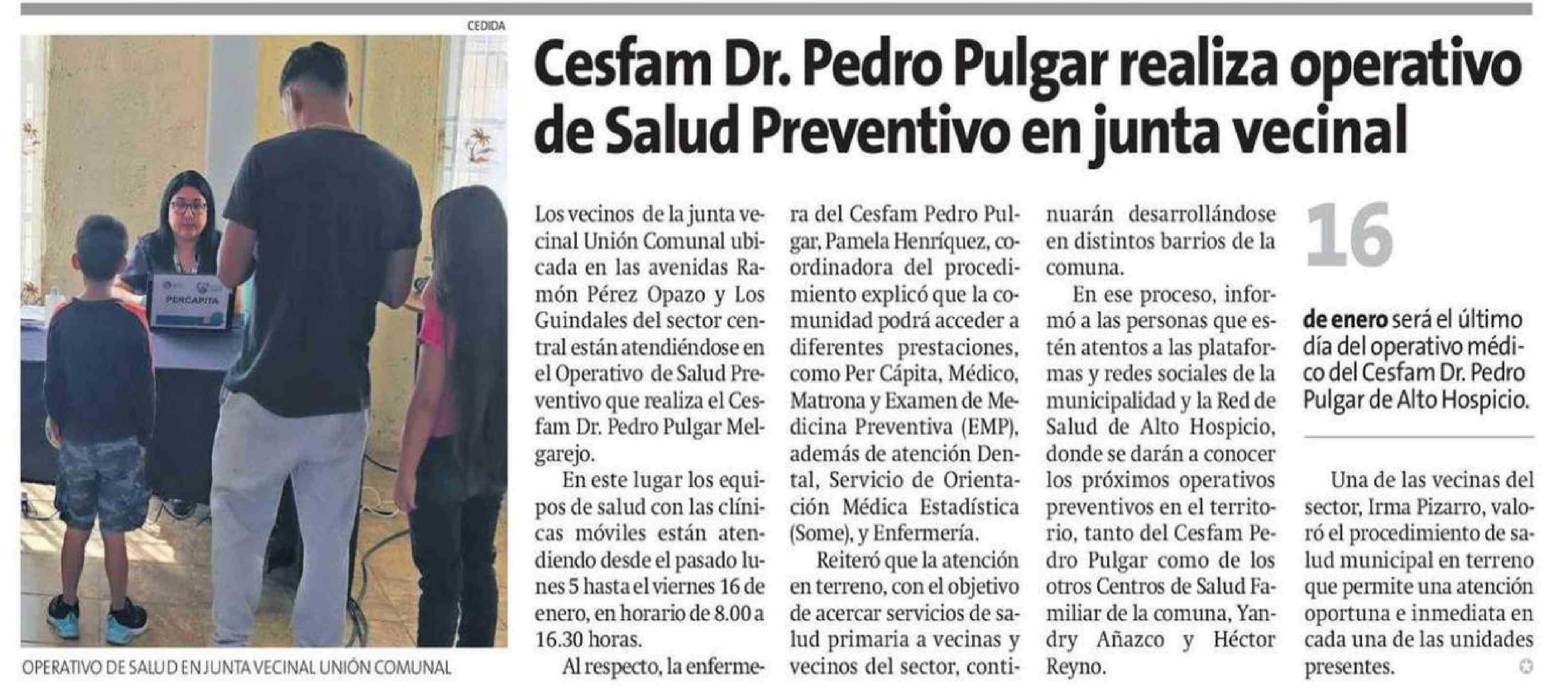 | Título: | Cesfam Dr. Pedro Pulgar realiza operativo de Salud Preventivo en junta vecinal |