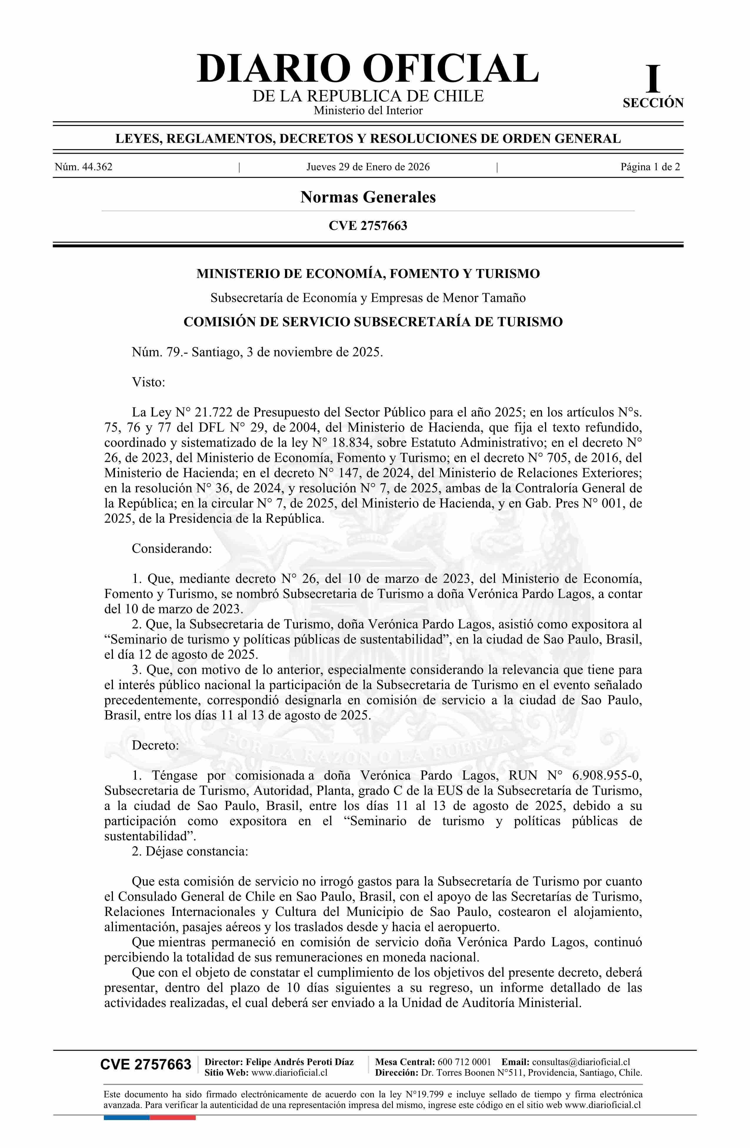 Título: Decreto número 79, de 2025.- Designa en comisión de servicio a doña Verónica Pardo Lagos, Subsecretaria de Turismo, a la ciudad de Sao Paulo, Brasil