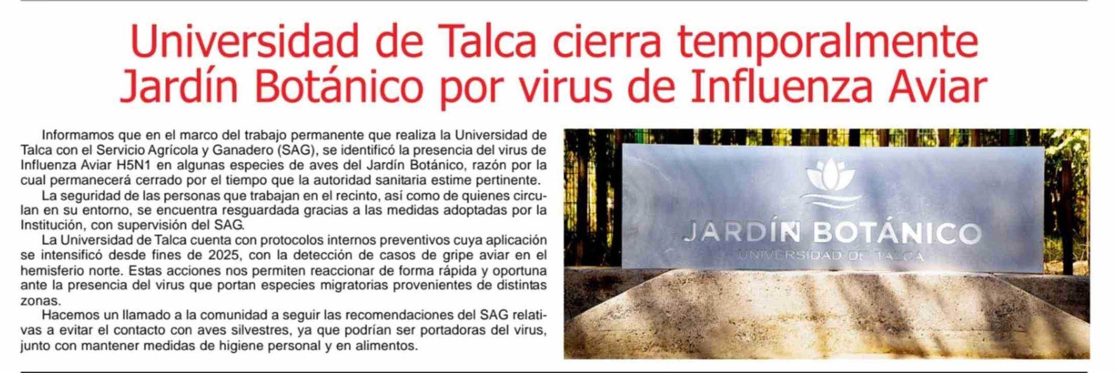 | Título: | Universidad de Talca cierra temporalmente Jardín Botánico por virus de Influenza Aviar |