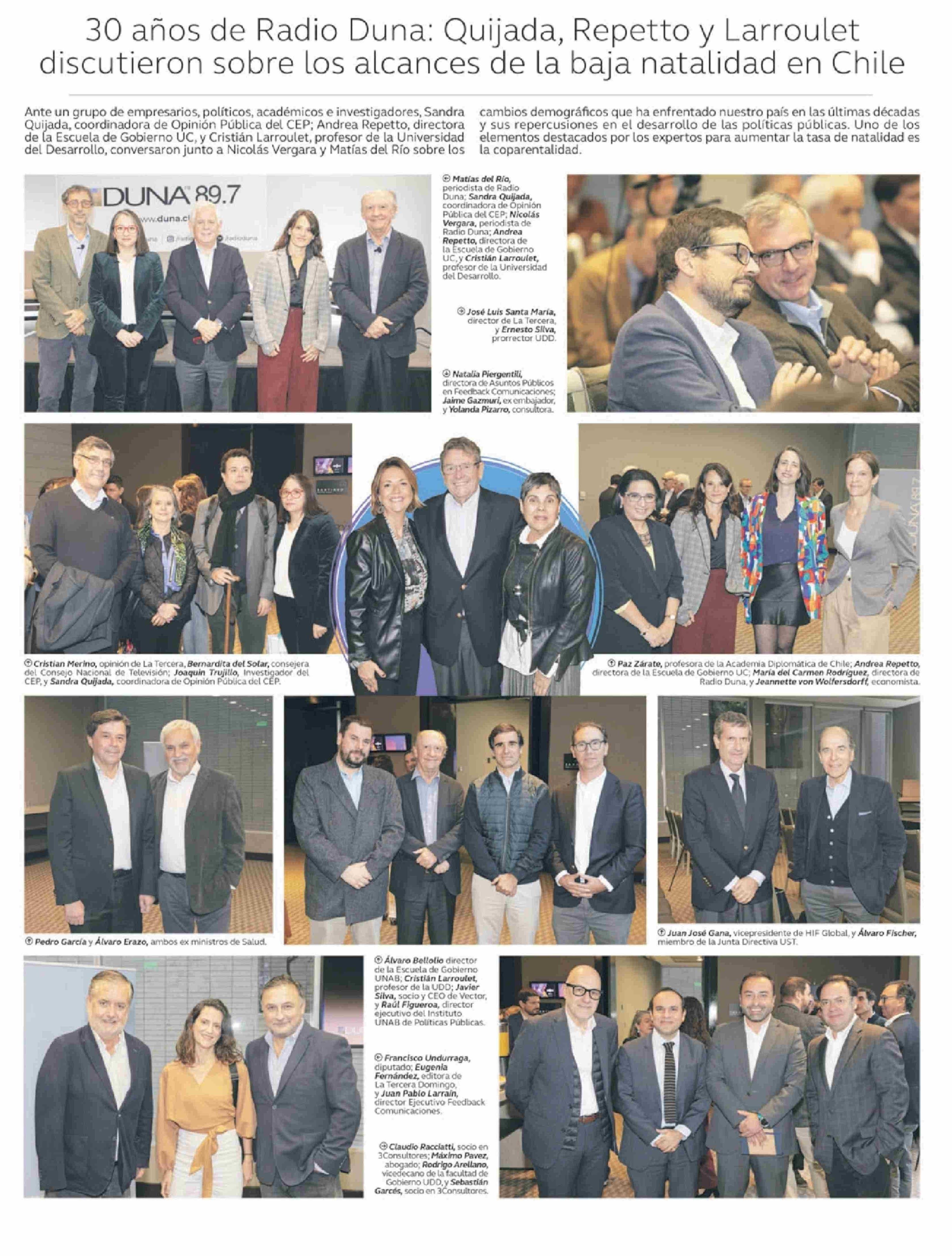 30 años de Radio Duna: Quijada, Repetto y Larroulet discutieron sobre los alcances de la baja natalidad en Chile 04-05-2025 La Tercera |