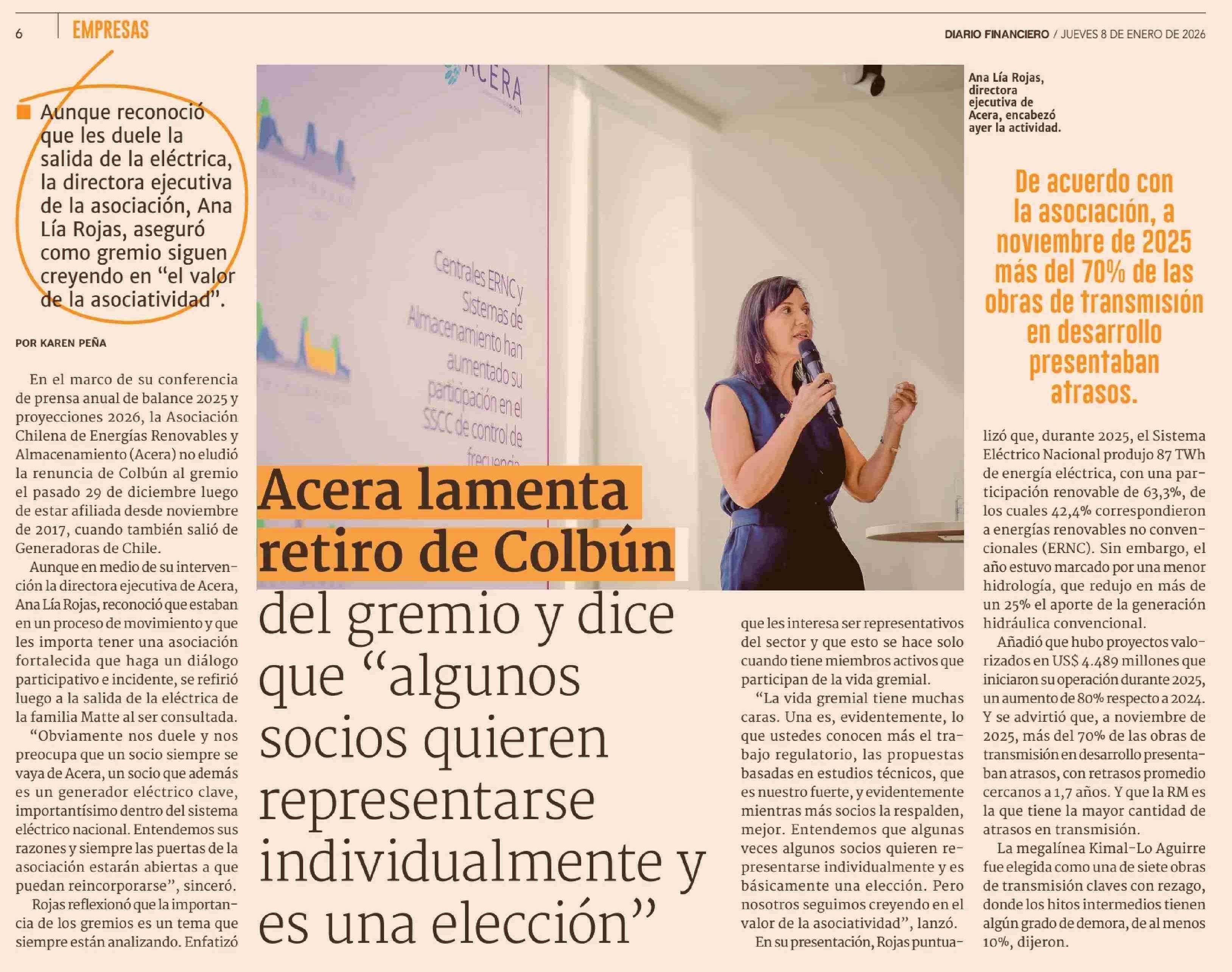 Acera lamenta retiro de Colbún del gremio y dice que "algunos socios quieren representarse individualmente y es una elección" 08-01-2026 Diario Financiero |