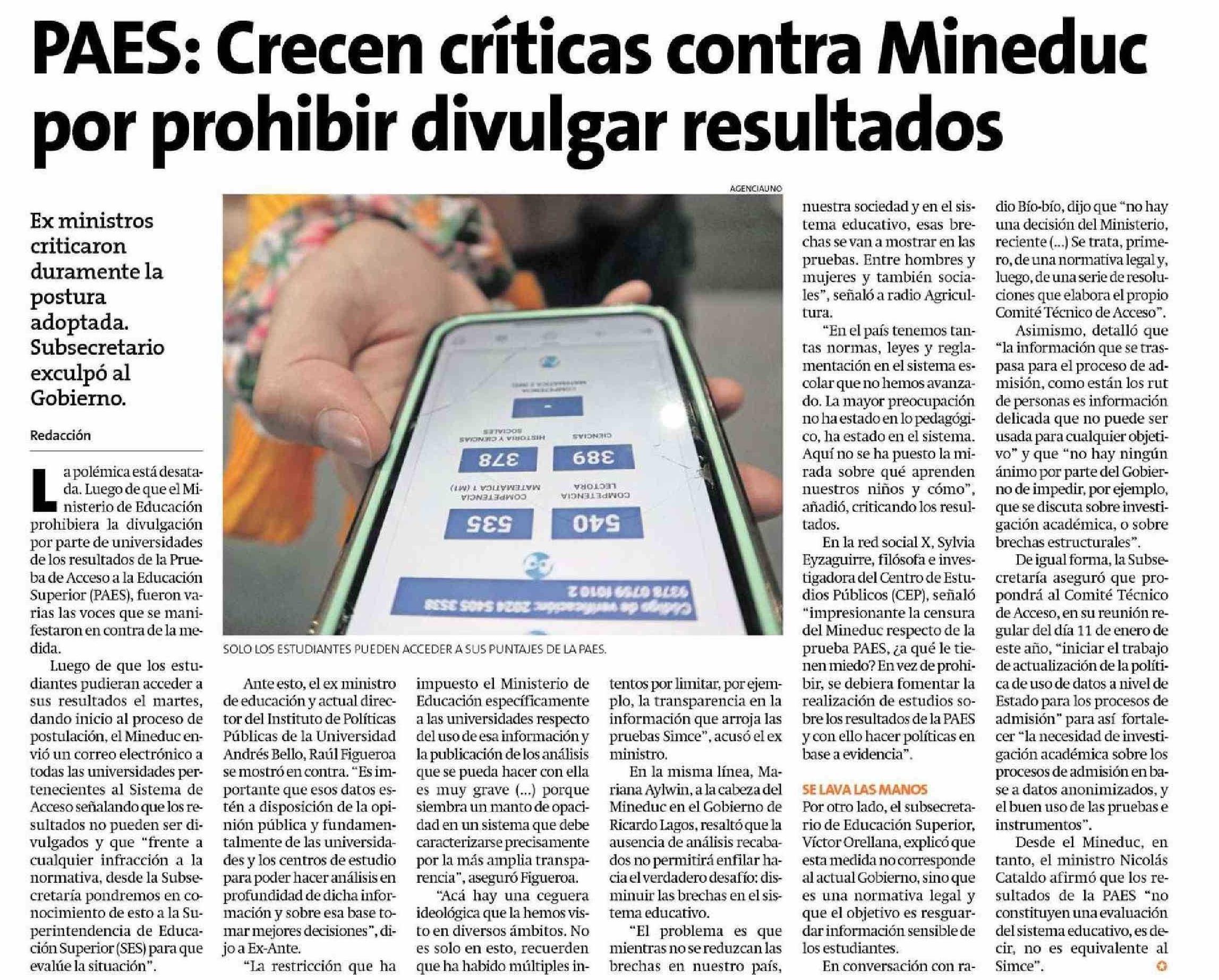 PAES: Crecen críticas contra Mineduc por prohibir divulgar resultados 04-01-2024 La Estrella de Iquique |
