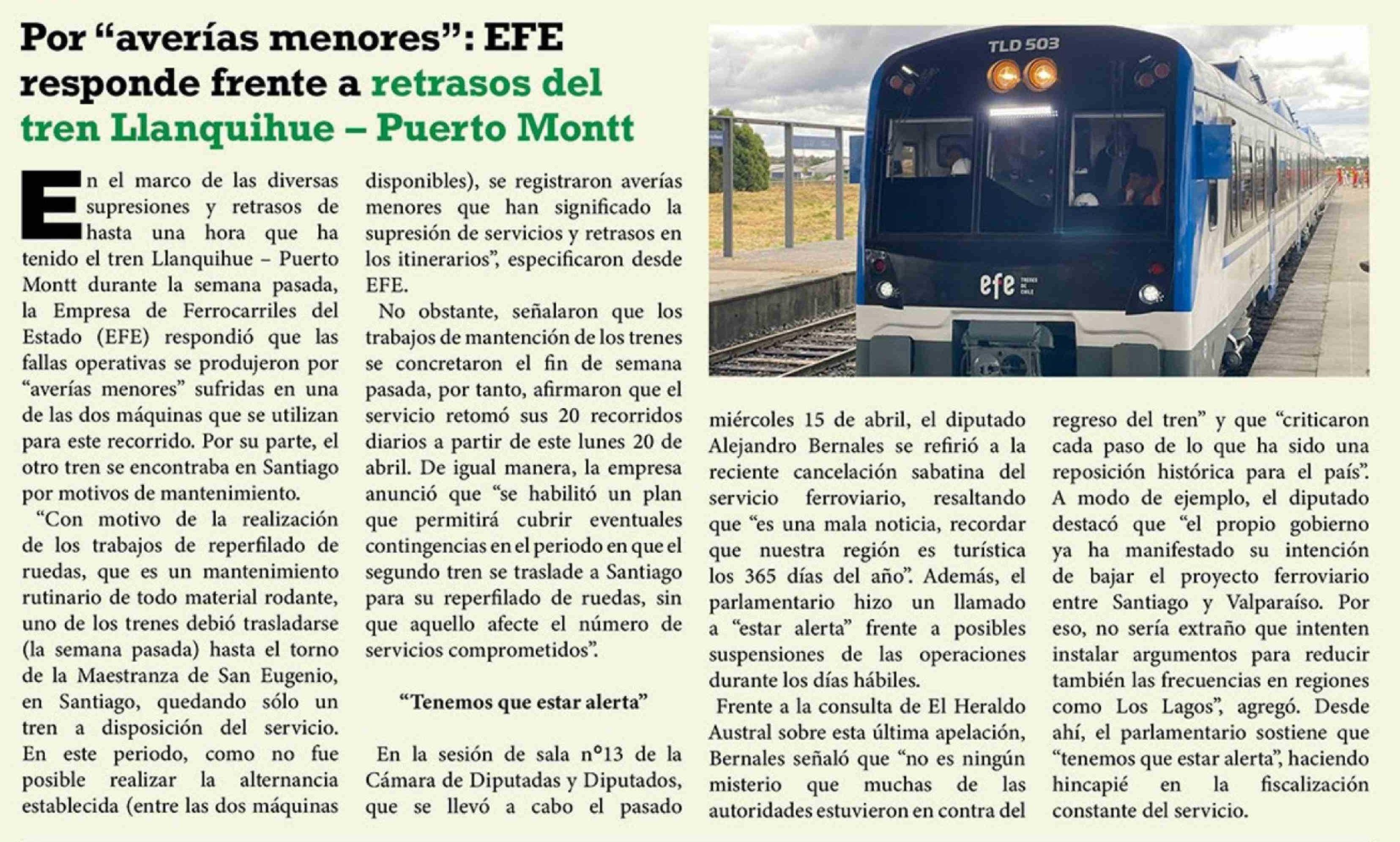 Por "averías menores": EFE responde frente a retrasos del tren Llanquihue - Puerto Montt 21-04-2026 El Heraldo Austral |