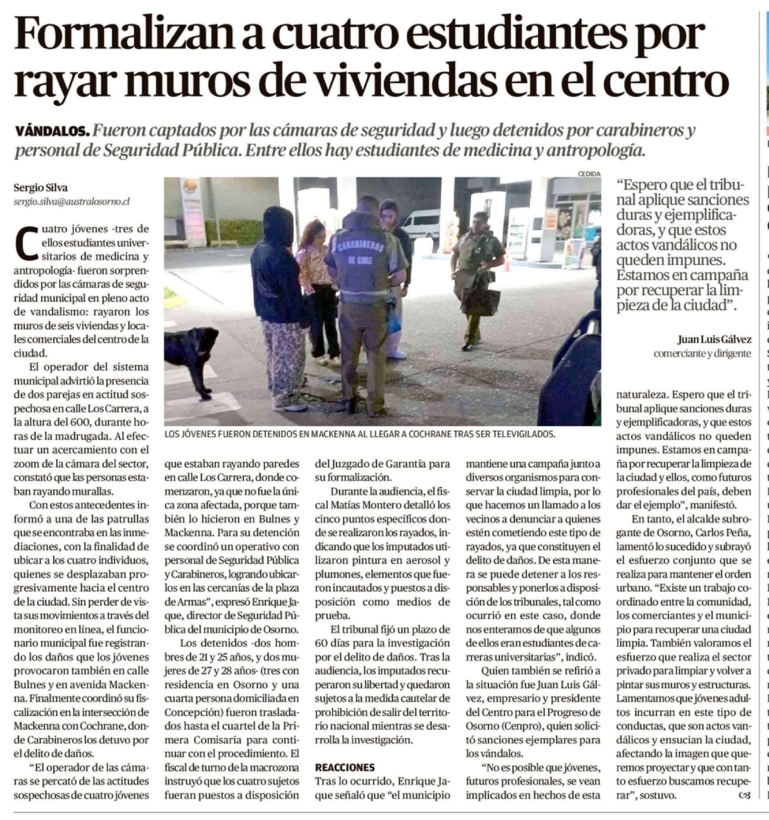 Formalizan a cuatro estudiantes por rayar muros de viviendas en el centro 27-02-2026 El Austral de Osorno |