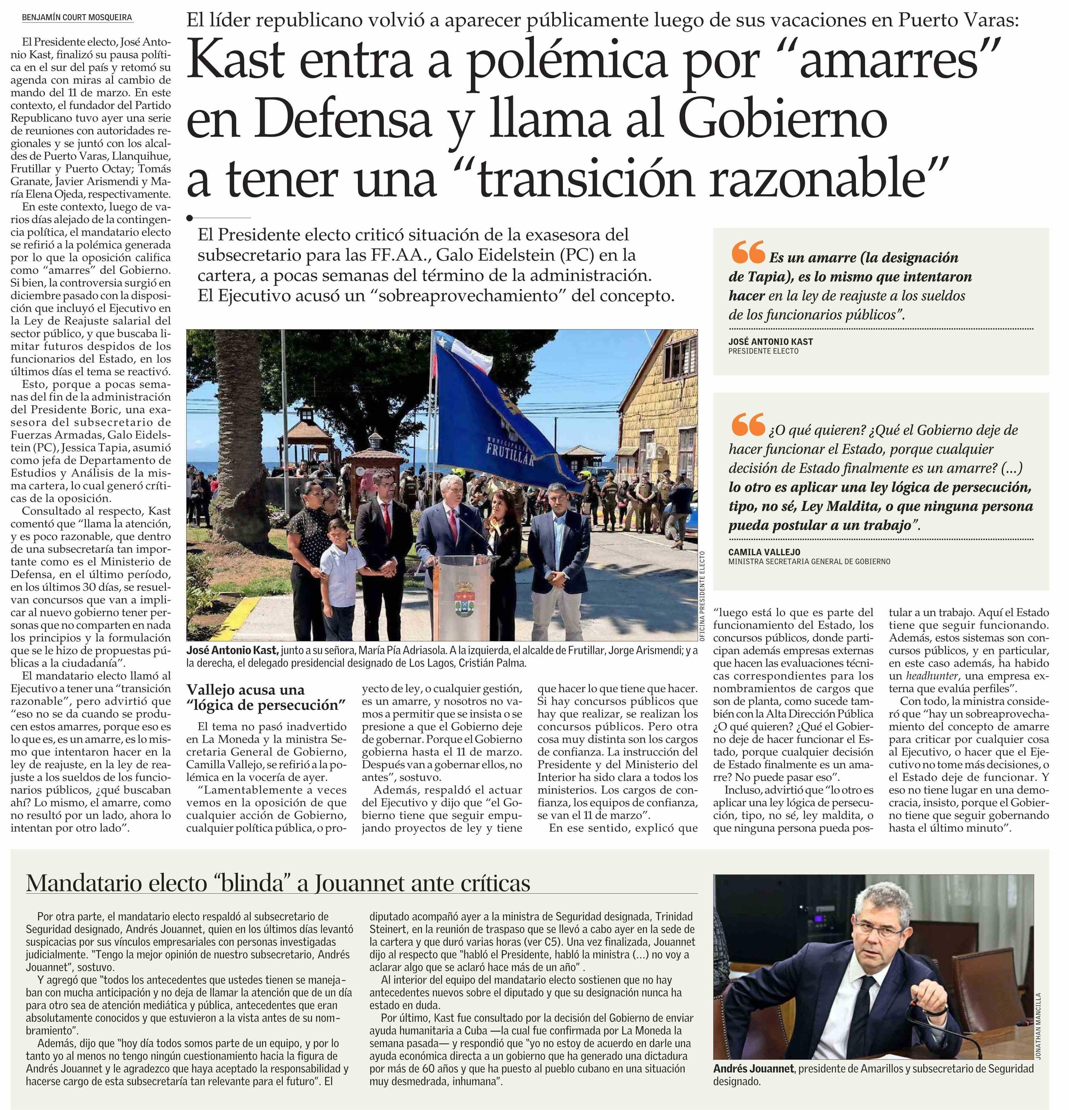 Título: Kast entra a polémica por “amarres” en Defensa y llama al Gobierno a tener una “transición razonable”