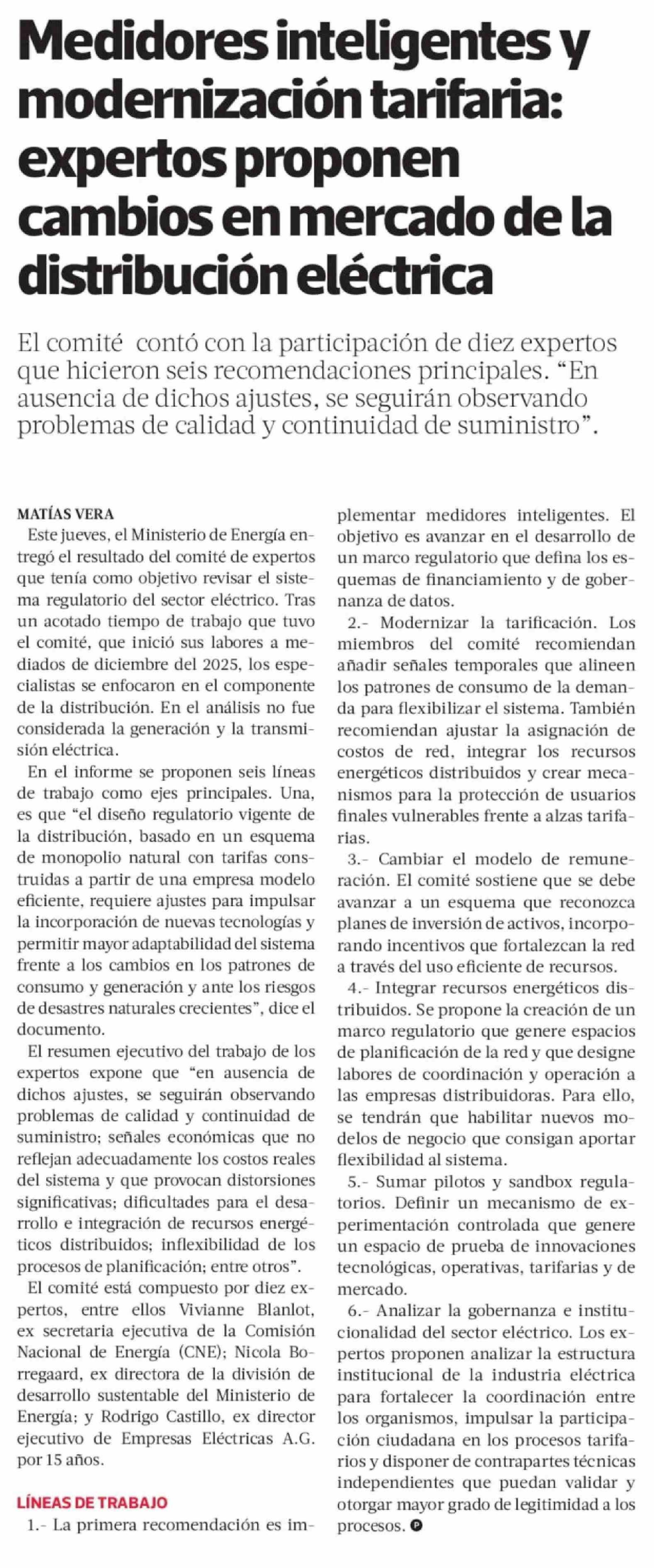 Medidores inteligentes y modernización tarifaria: expertos proponen cambios en mercado de la distribución eléctrica 06-03-2026 La Tercera |