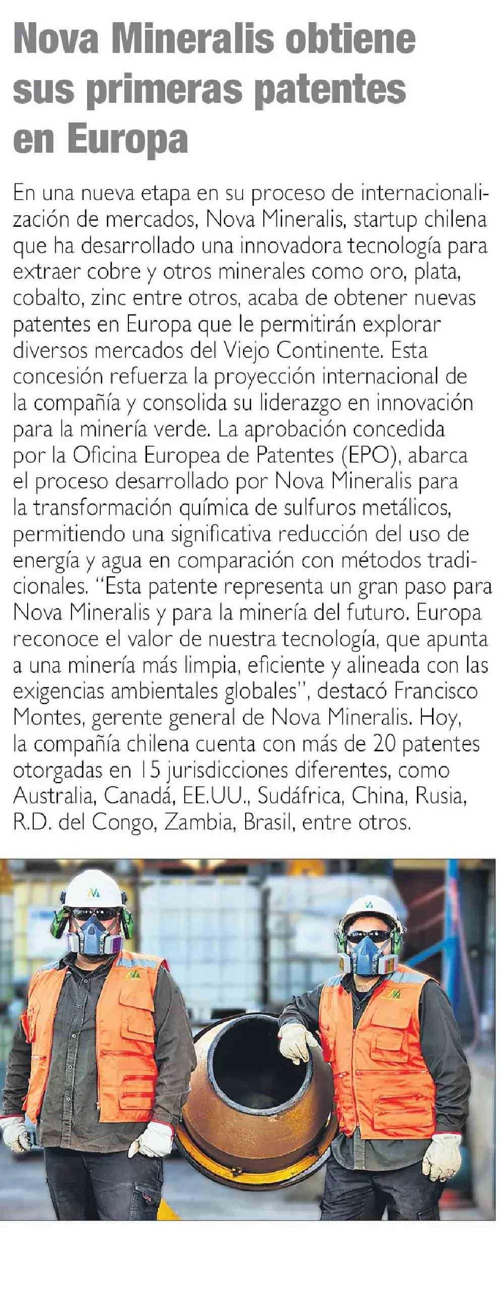 Nova Mineralis obtiene sus primeras patentes en Europa 30-05-2025 Las Últimas Noticias |