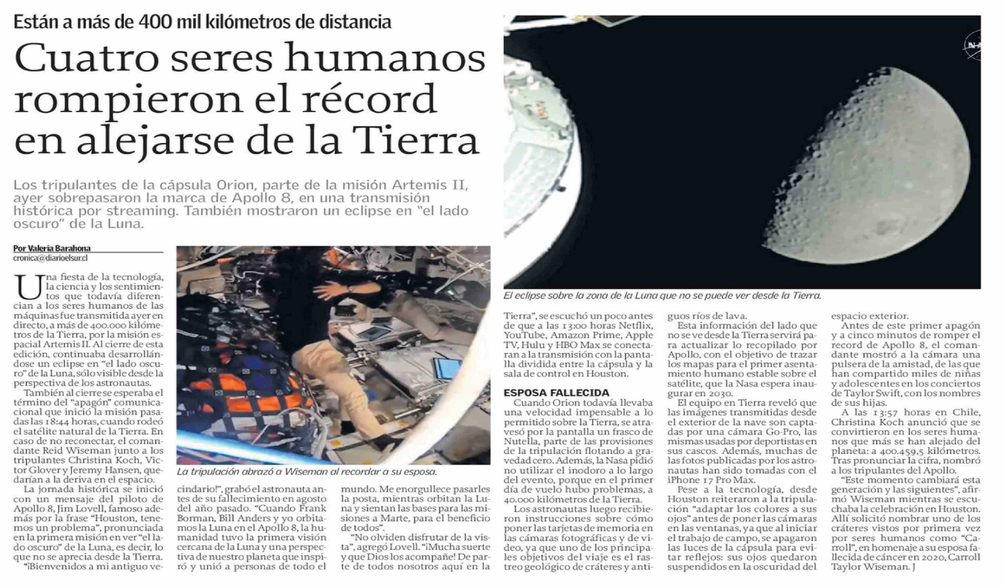 Cuatro seres humanos rompieron el récord en alejarse de la Tierra 07-04-2026 El Sur |
