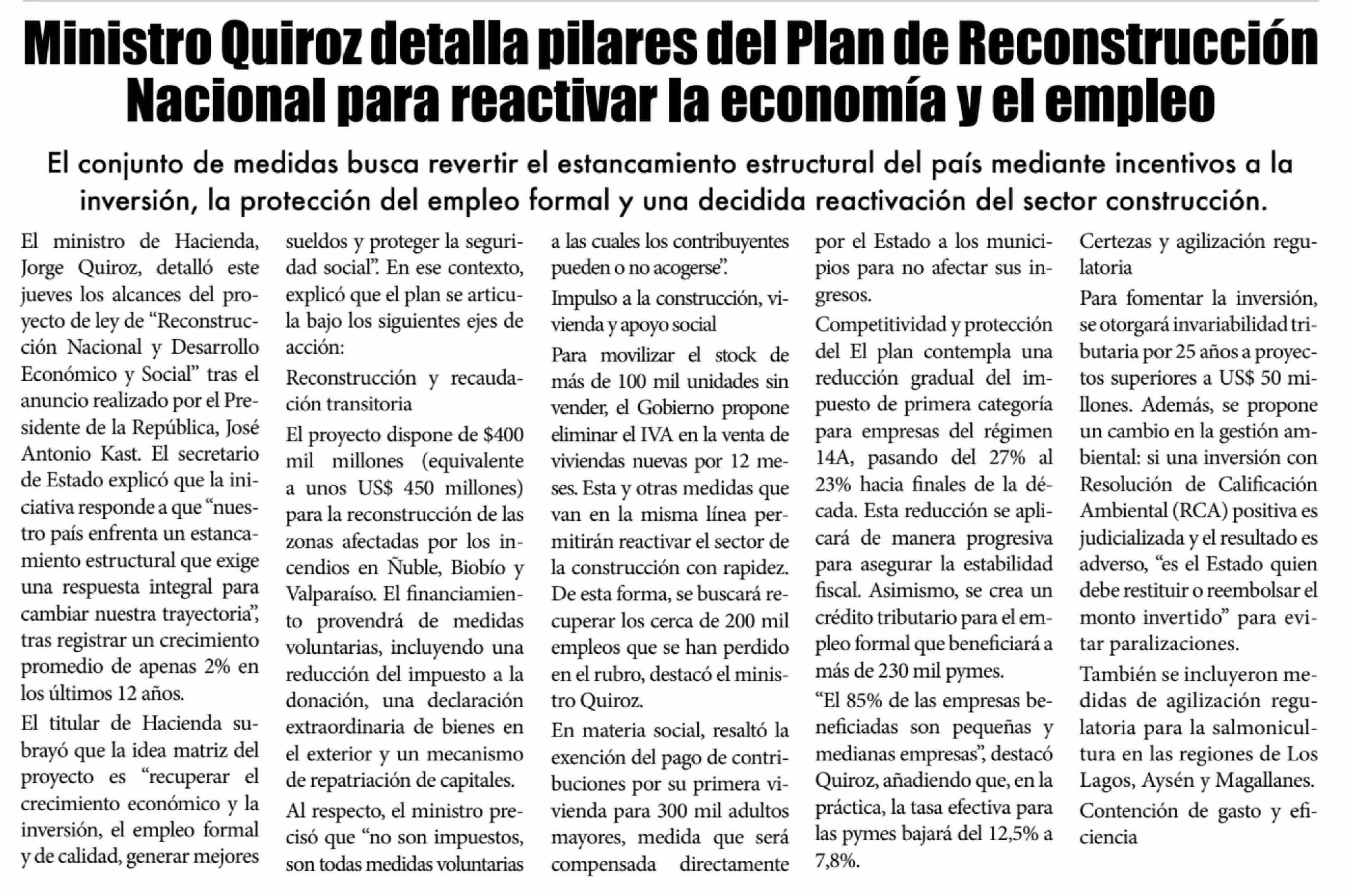 Ministro Quiroz detalla pilares del Plan de Reconstrucción Nacional para reactivar la economía y el empleo 19-04-2026 El Lector |