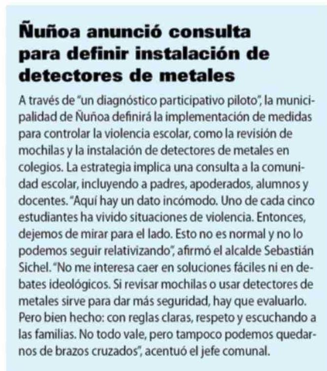 | Título: | Ñuñoa anunció consulta para definir instalación de detectores de metales |
