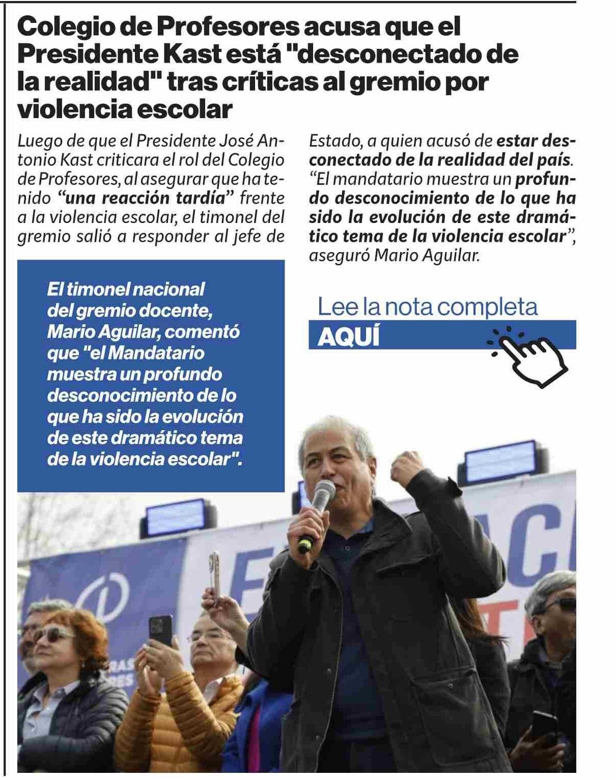 | Título: | Colegio de Profesores acusa que el Presidente Kast está "desconectado de la realidad" tras críticas al gremio por violencia escolar |