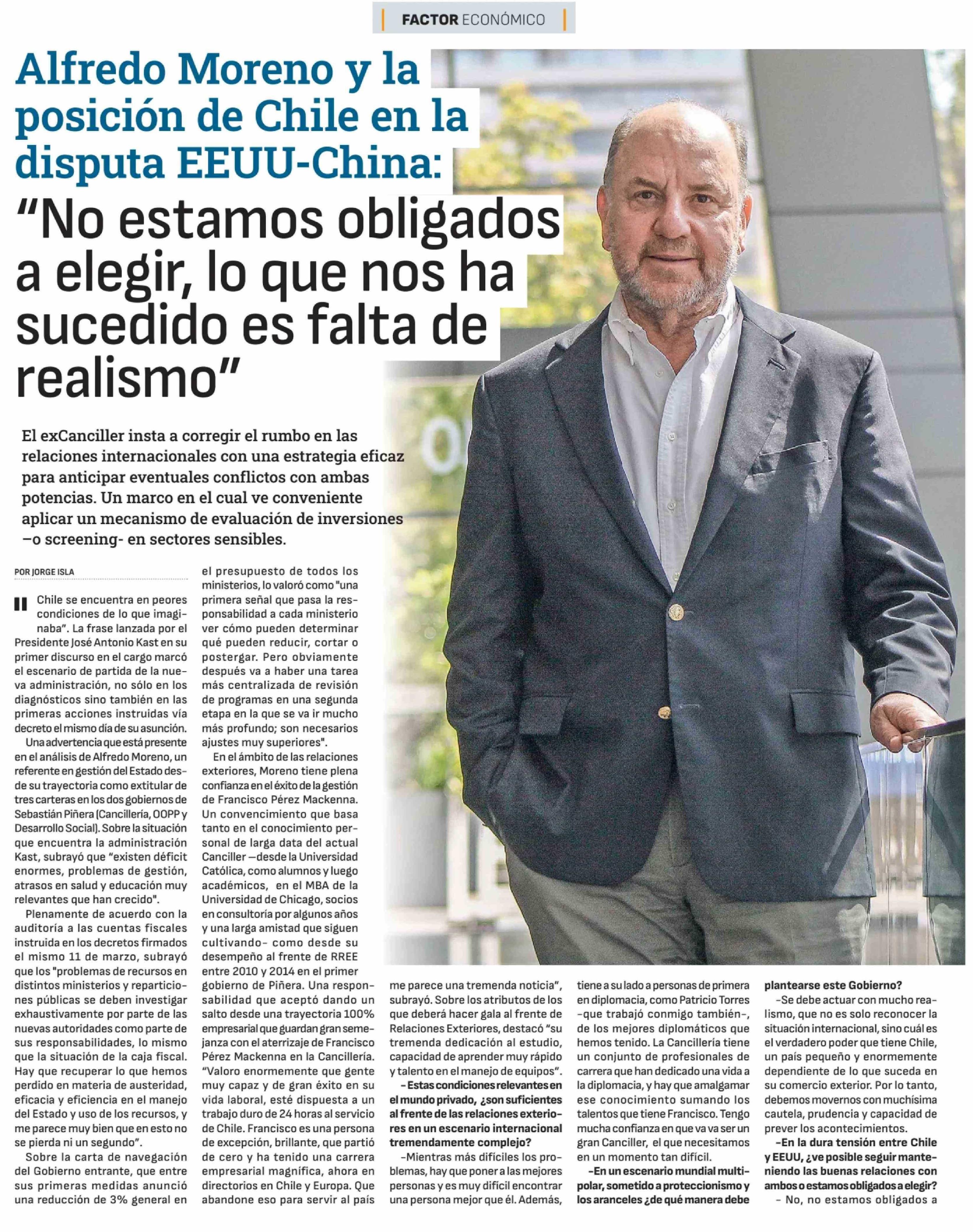 Alfredo Moreno y la posición de Chile en la disputa EEUU-China: "No estamos obligados a elegir, lo que nos ha sucedido es falta de realismo" 14-03-2026 Diario Financiero |