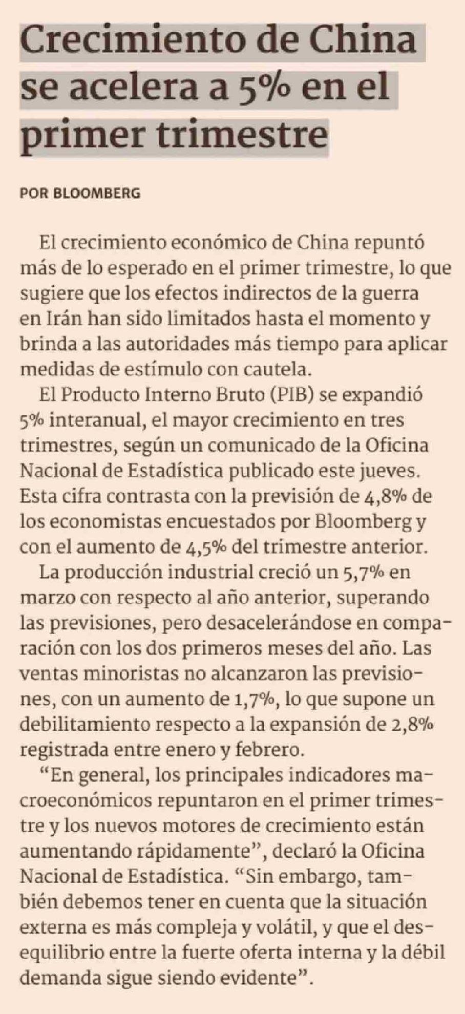 Crecimiento de China se acelera a 5% en el primer trimestre 16-04-2026 Diario Financiero |