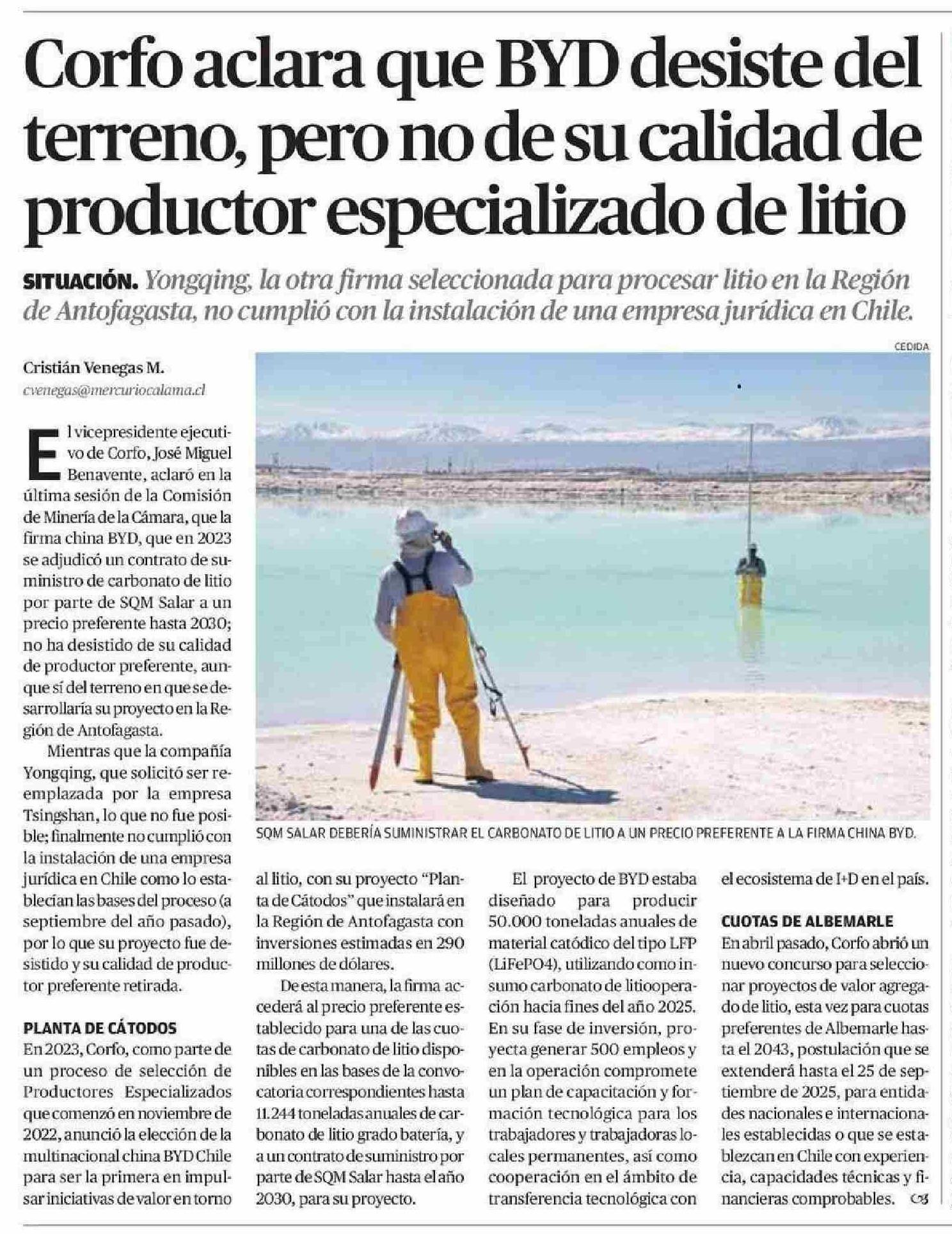 Corfo aclara que BYD desiste del terreno, pero no de su calidad de productor especializado de litio 17-05-2025 El Mercurio de Calama |