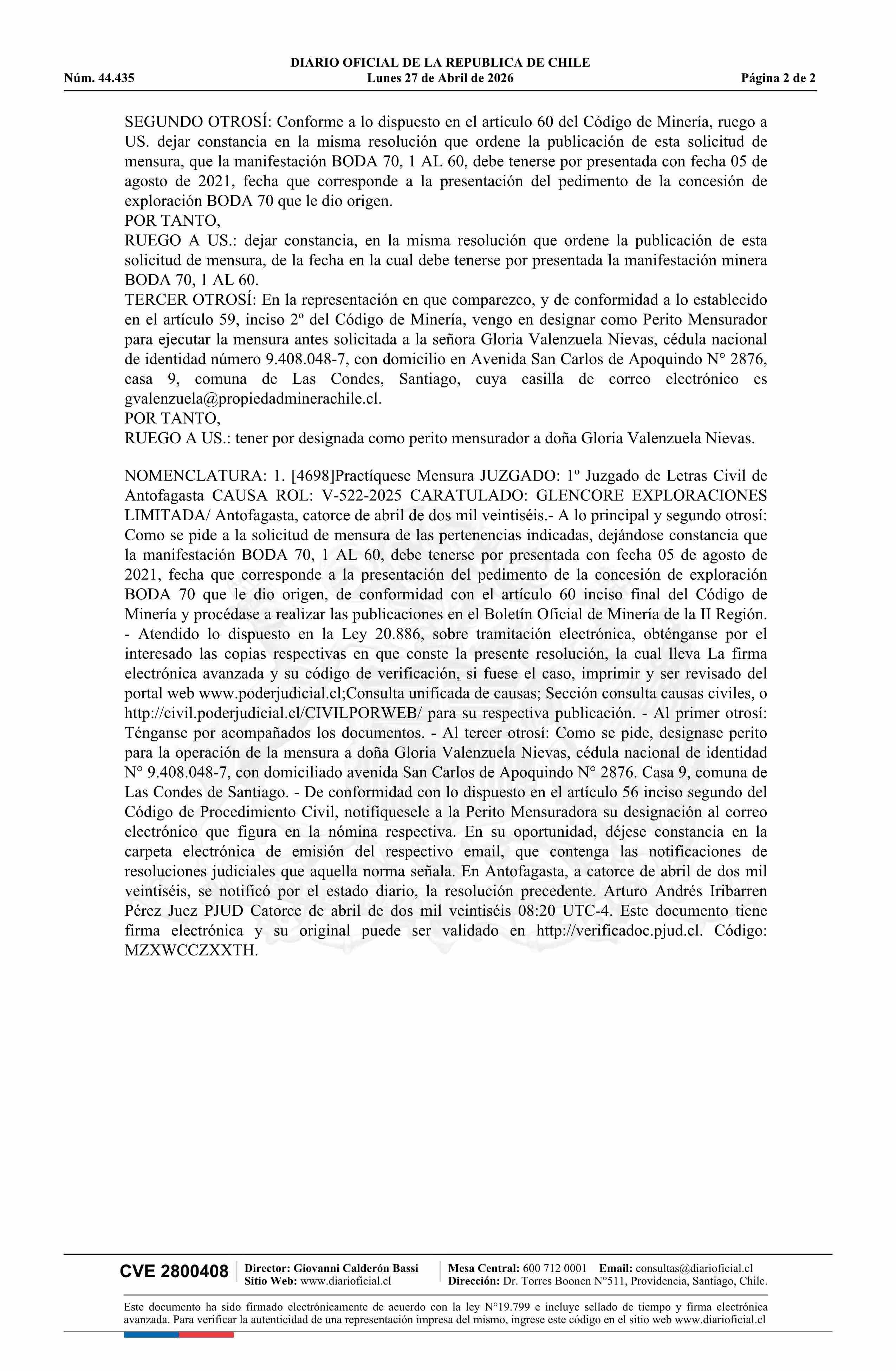 BODA 70, 1 AL 60 / Glencore Exploraciones Limitada 27-04-2026 DIARIO OFICIAL CHILE - BOLETÍN OFICIAL DE MINERÍA |