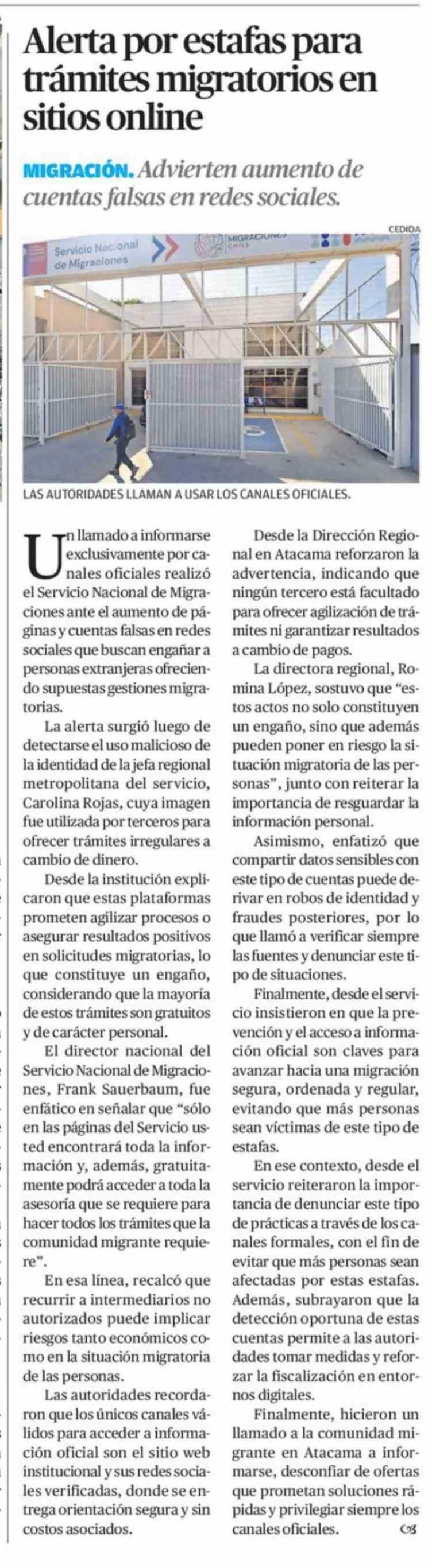 Alerta por estafas para trámites migratorios en sitios online 14-04-2026 El Diario de Atacama |