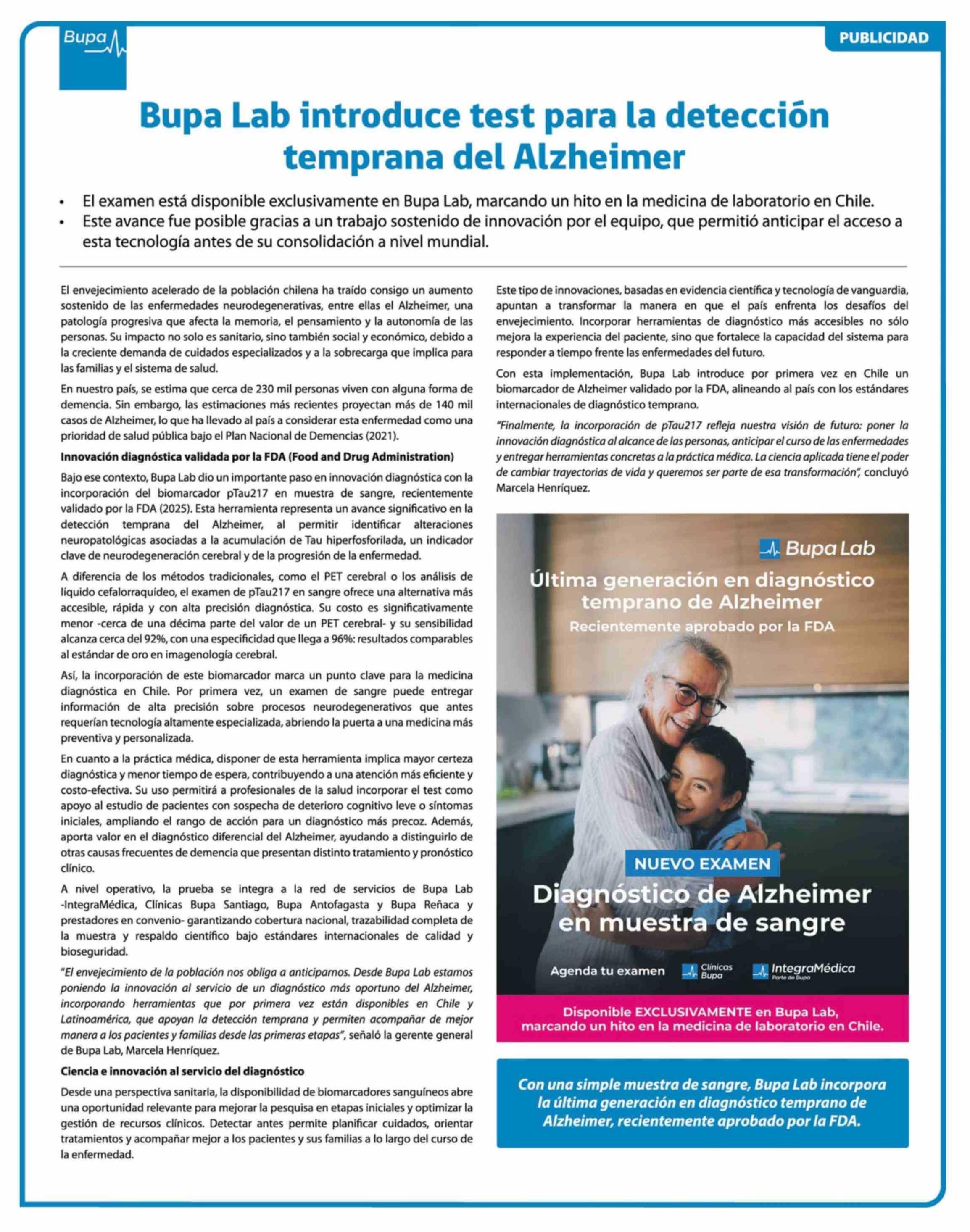 Bupa Lab introduce test para la detección temprana del Alzheimer 18-02-2026 Las Últimas Noticias |