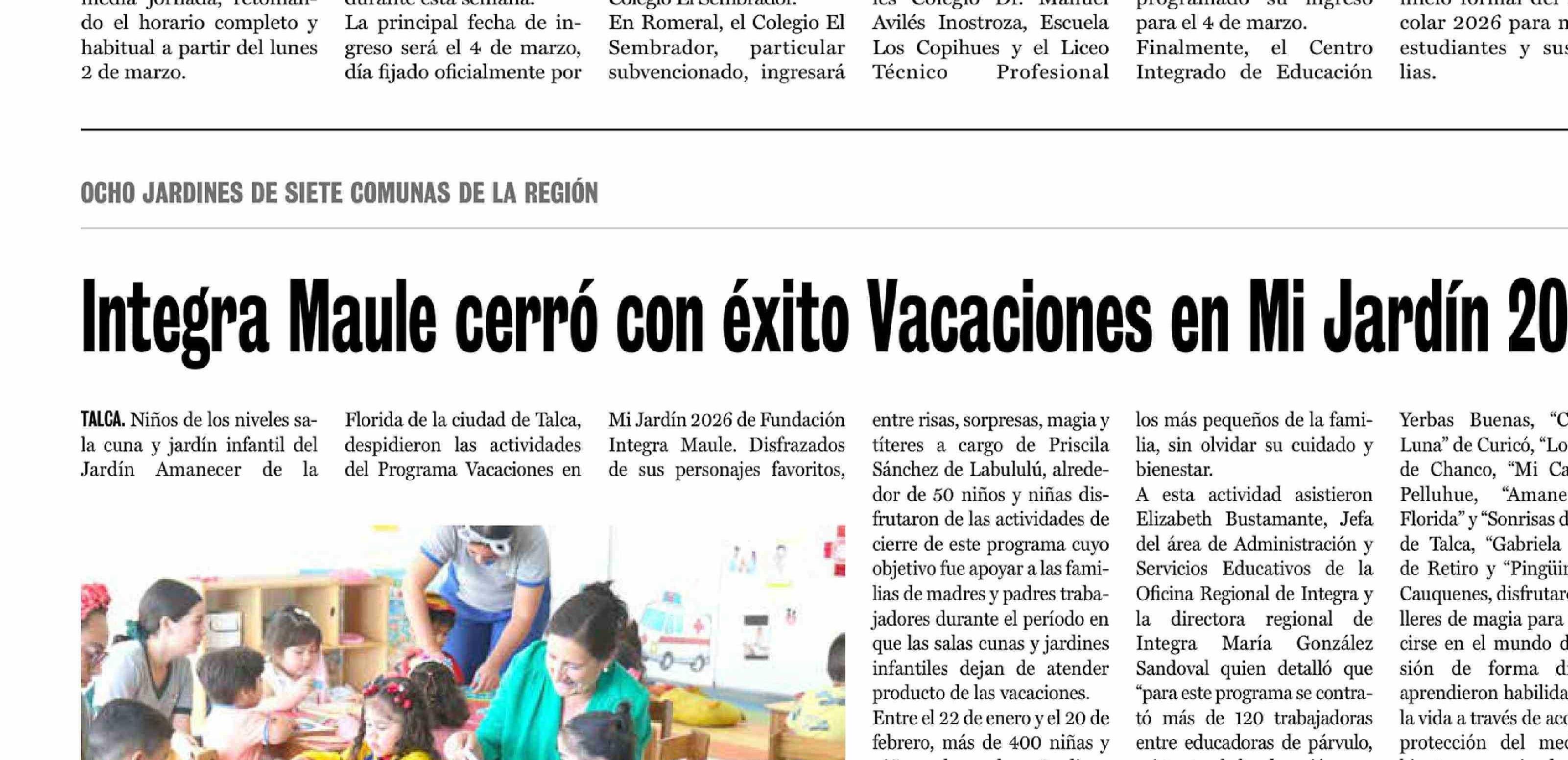 Título: Integra Maule cerró con éxito Vacaciones en Mi Jardín 2026