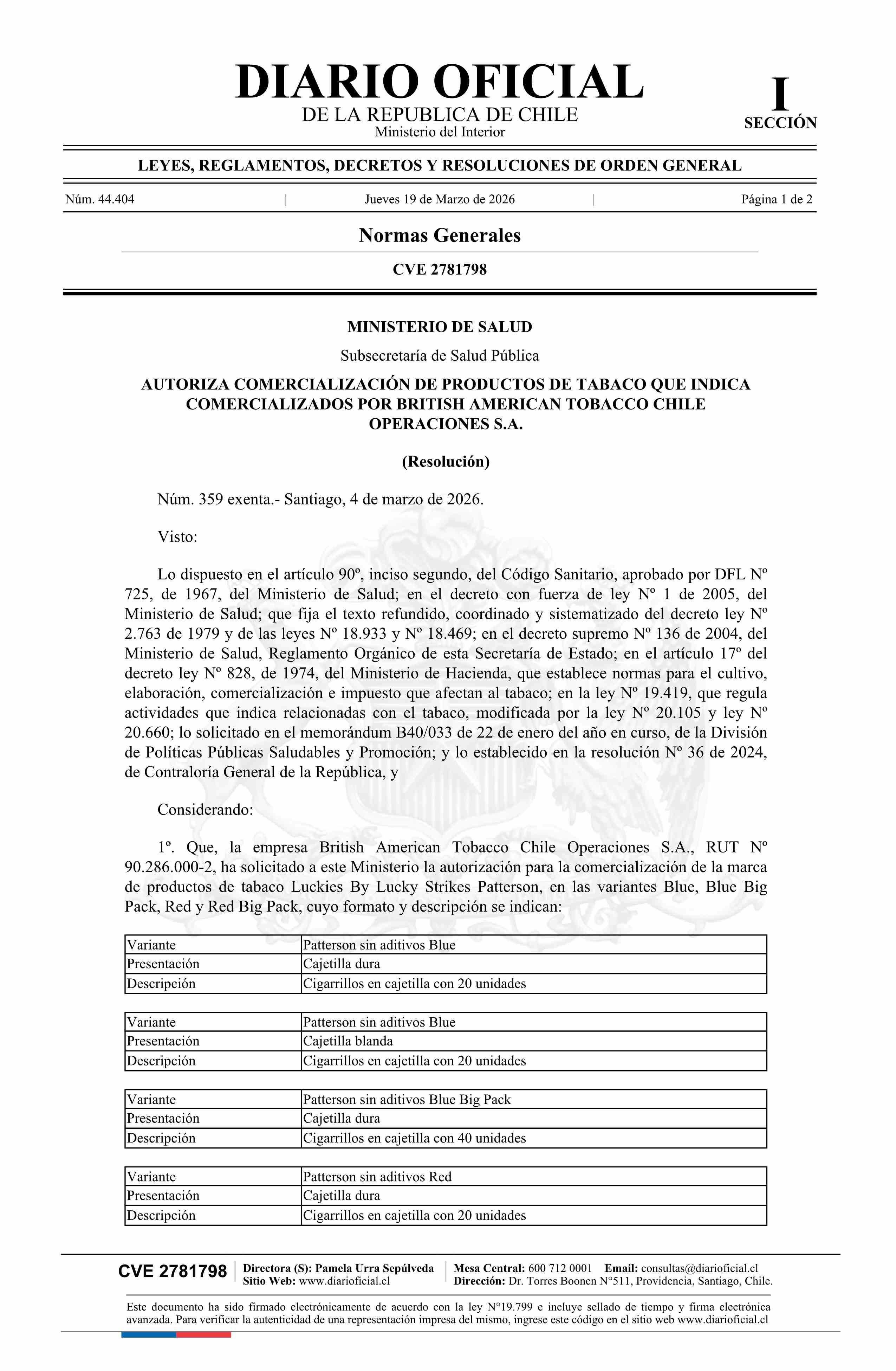 Resolución exenta número 359, de 2026.- Autoriza comercialización de productos de tabaco que indica comercializados por British American Tobacco Chile Operaciones S.A. 19-03-2026 Diario Oficial Edición Electrónica |
