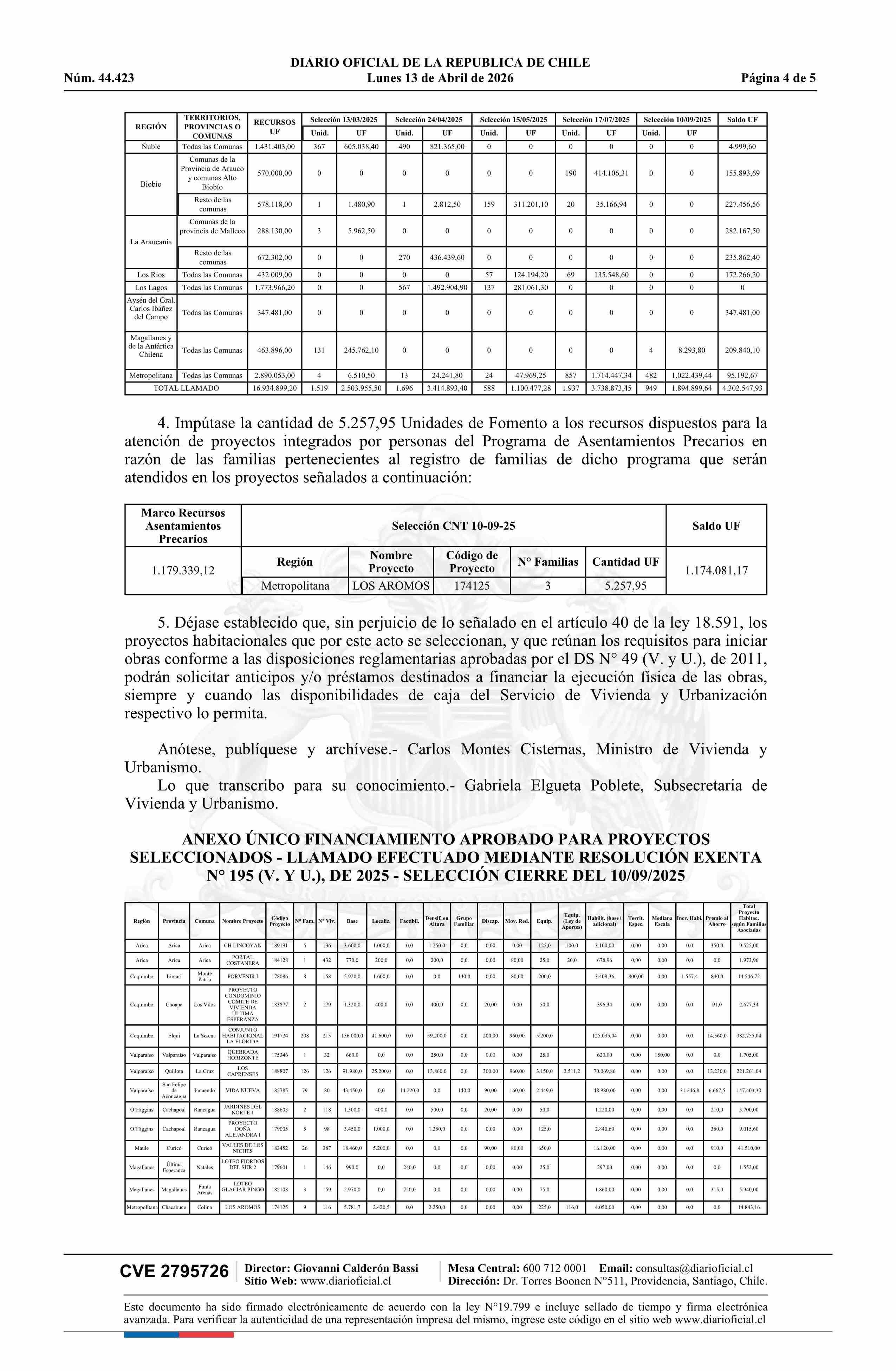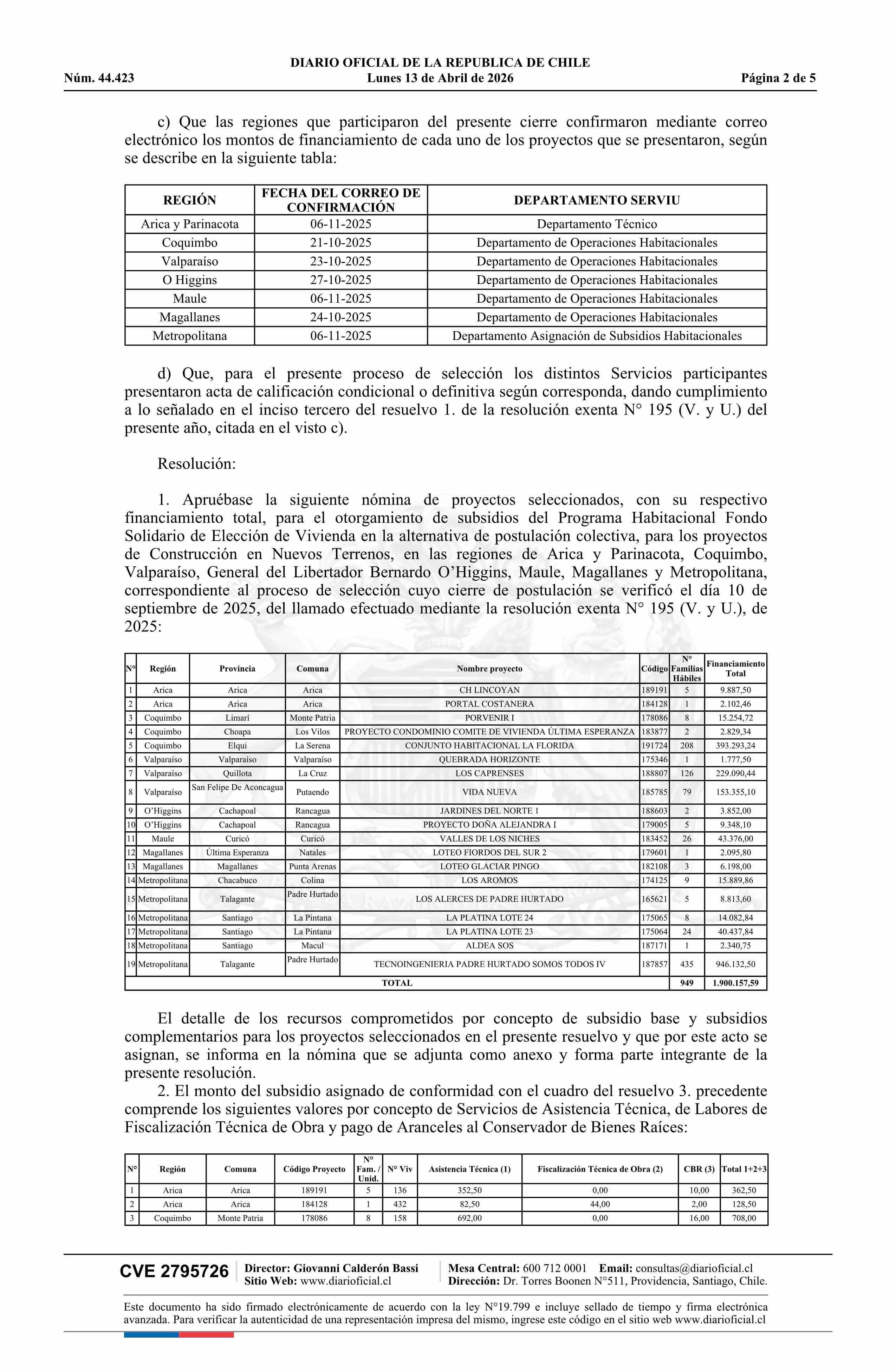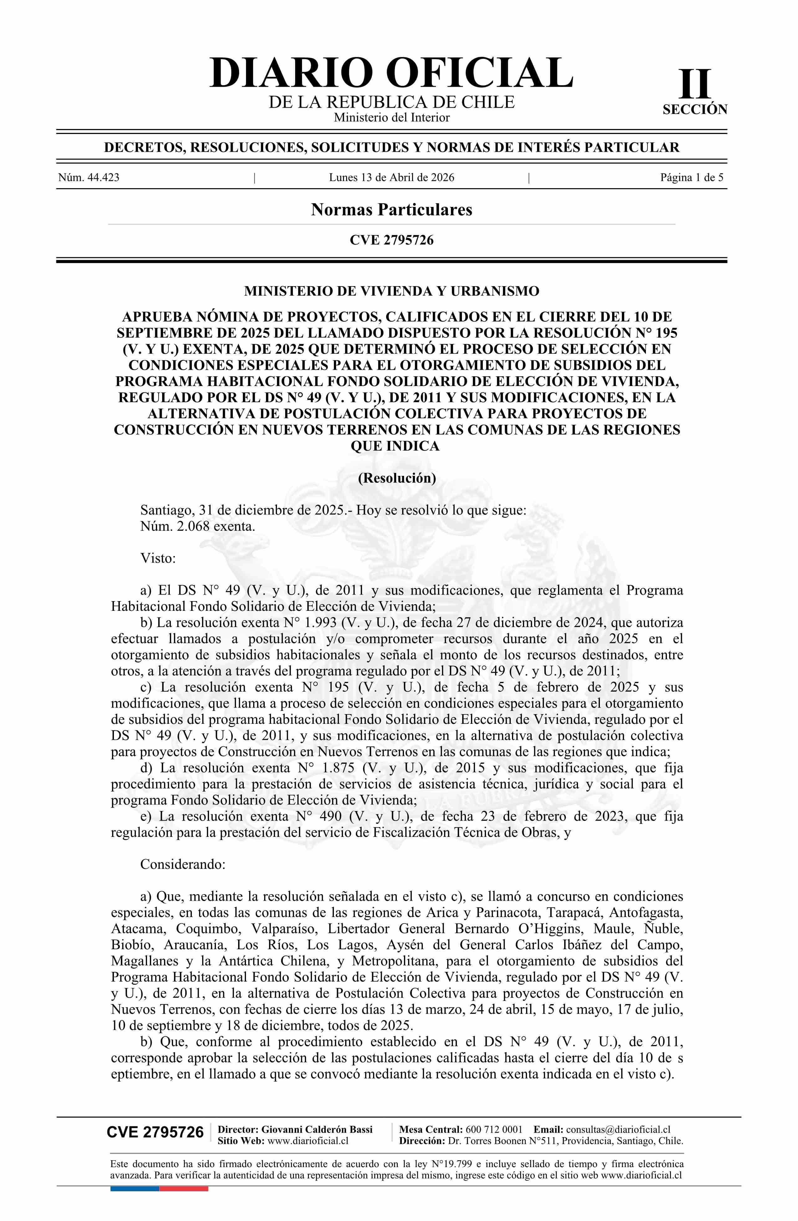 Título: Resolución exenta número 2.068, de 2025.- Aprueba nómina de proyectos, calificados en el cierre del 10 de septiembre de 2025 del llamado dispuesto por la resolución N° 195 exenta, de 2025, que determinó el proceso de selección en condiciones especiales para el otorgamiento de subsidios del Programa