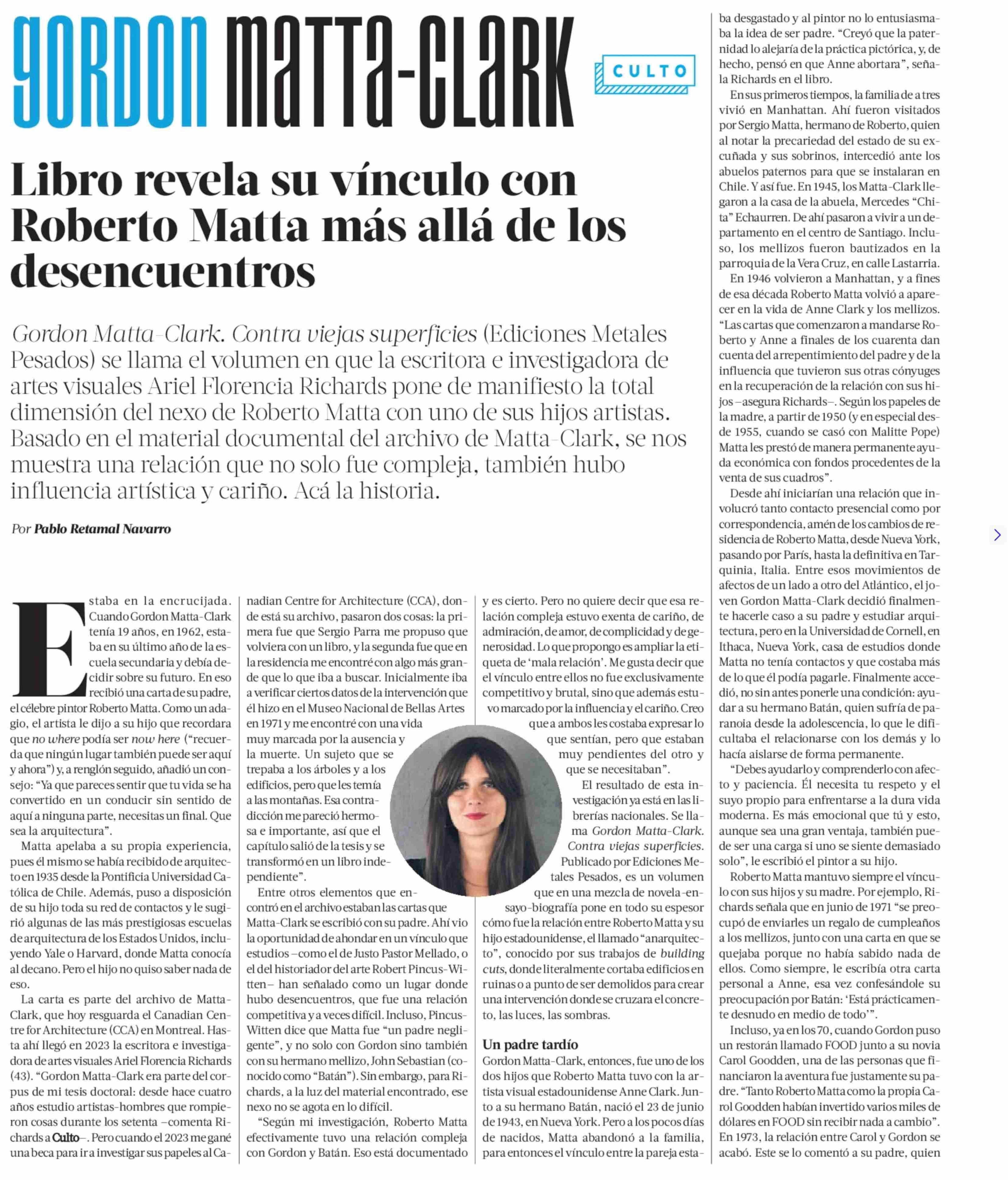 GORDON MATTA.CLARK Libro revela su vínculo con Roberto Matta más allá de los desencuentros 12-01-2025 La Tercera |