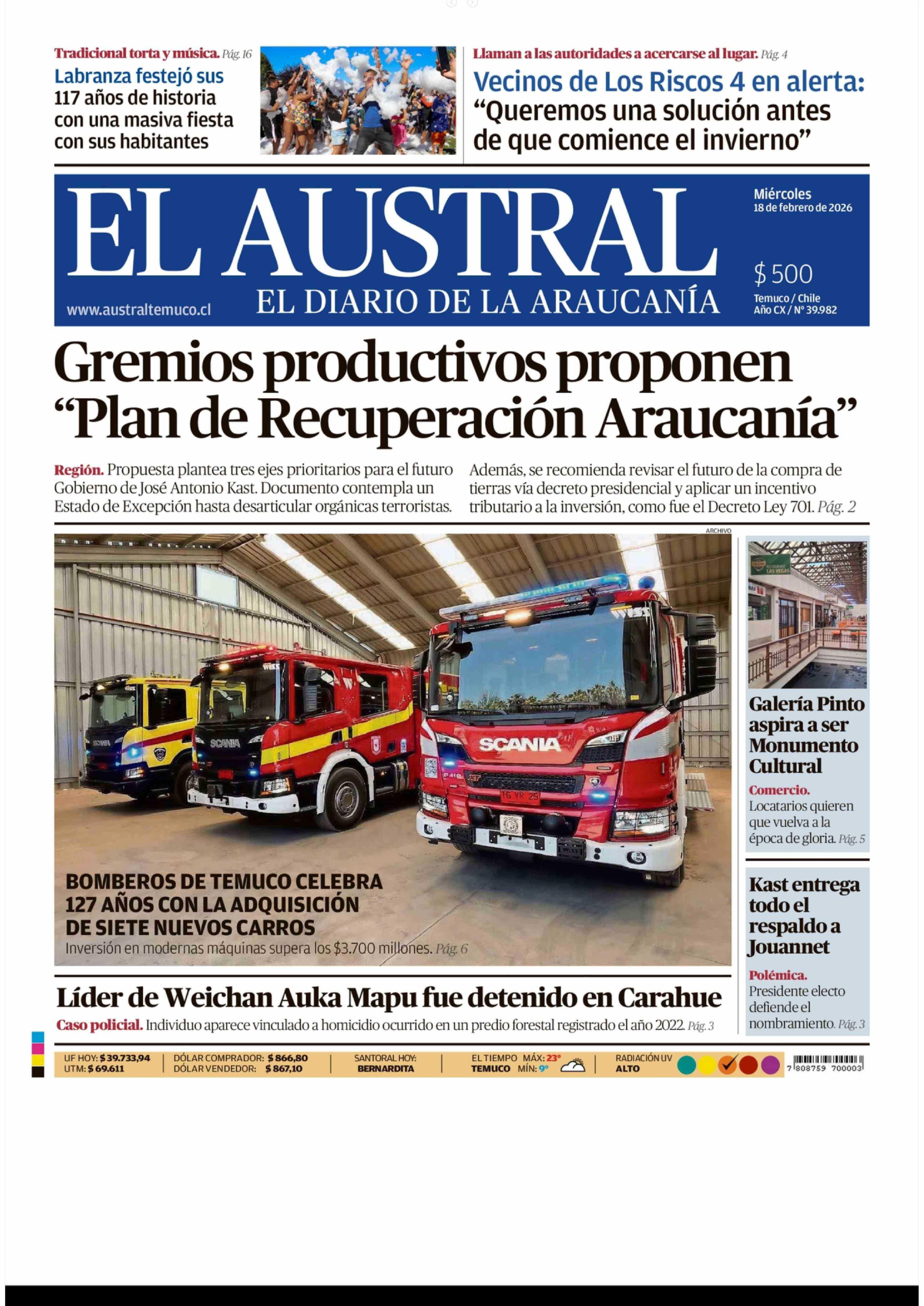 Fecha: 18-02-2026 Sector: Portada Región: Región de la Araucanía