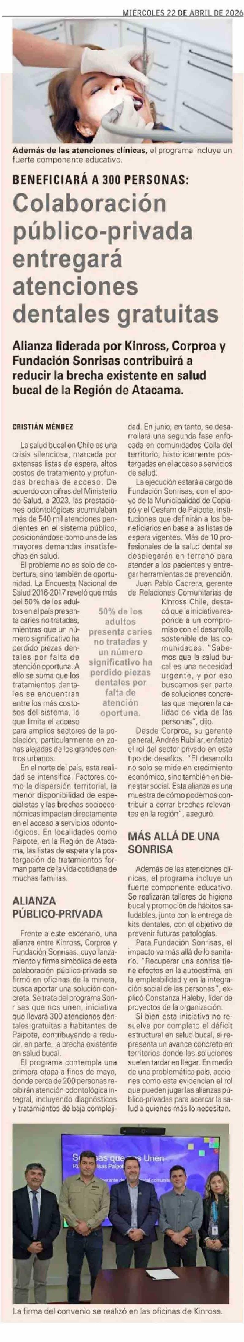 Colaboración público-privada entregará atenciones dentales gratuitas 22-04-2026 El Mercurio |