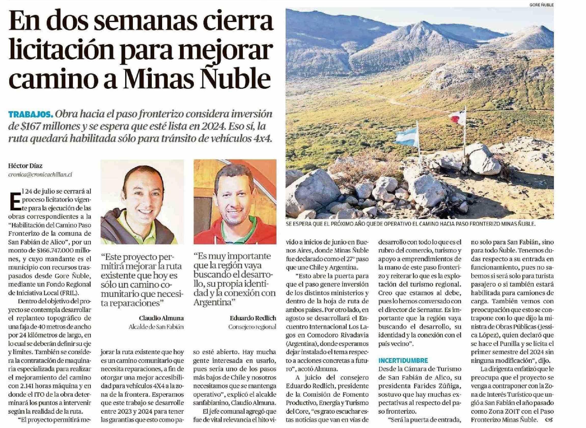 En dos semanas cierra licitación para mejorar camino a Minas Ñuble 11-07-2023 Crónica de Chillán |