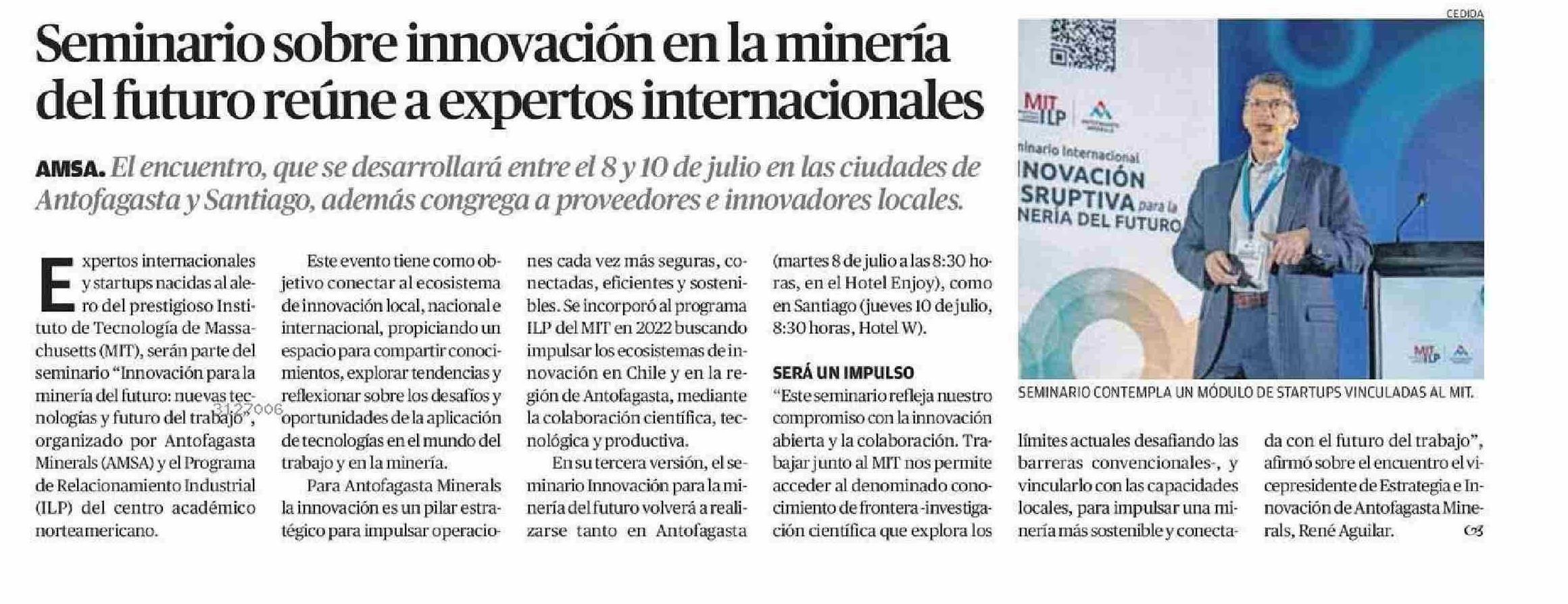 Seminario sobre innovación en la minería del futuro reúne a expertos internacionales 26-06-2025 El Mercurio de Calama |