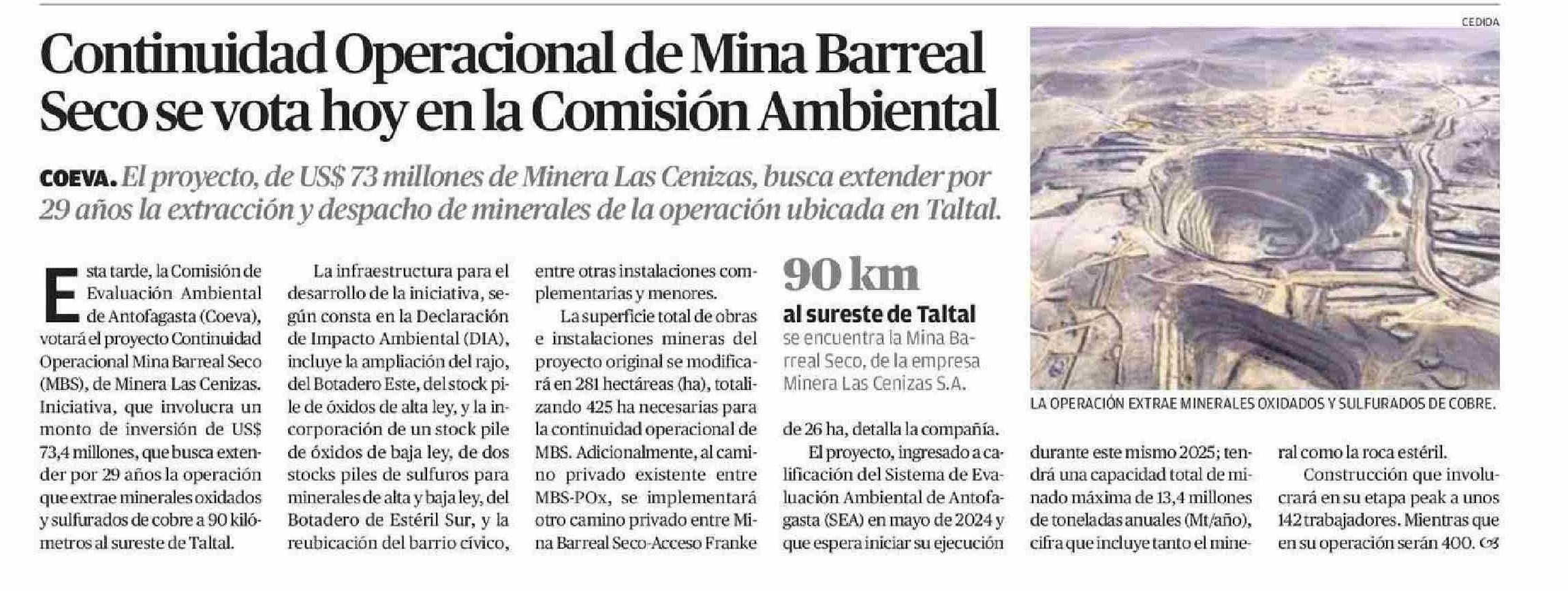 Título: Continuidad Operacional de Mina Barreal Seco se vota hoy en la Comisión Ambiental