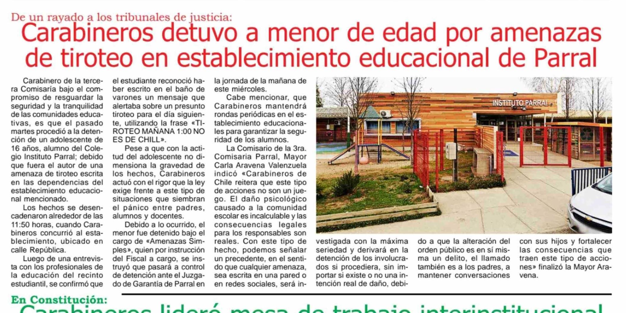 Título: Carabineros detuvo a menor de edad por amenazas de tiroteo en establecimiento educacional de Parral