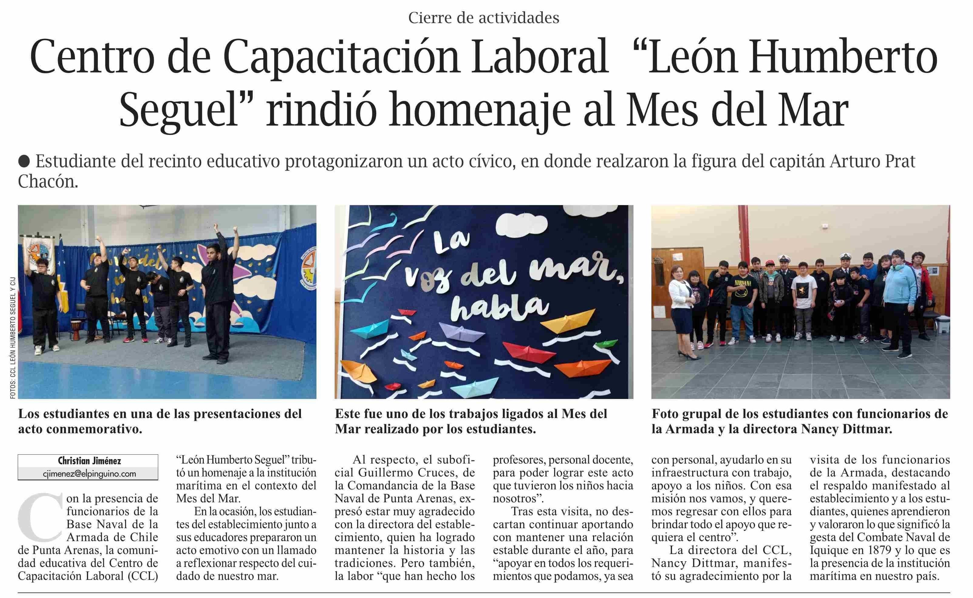 Centro de Capacitación Laboral “León Humberto Seguel” rindió homenaje al Mes del Mar 31-05-2025 El Pingüino |