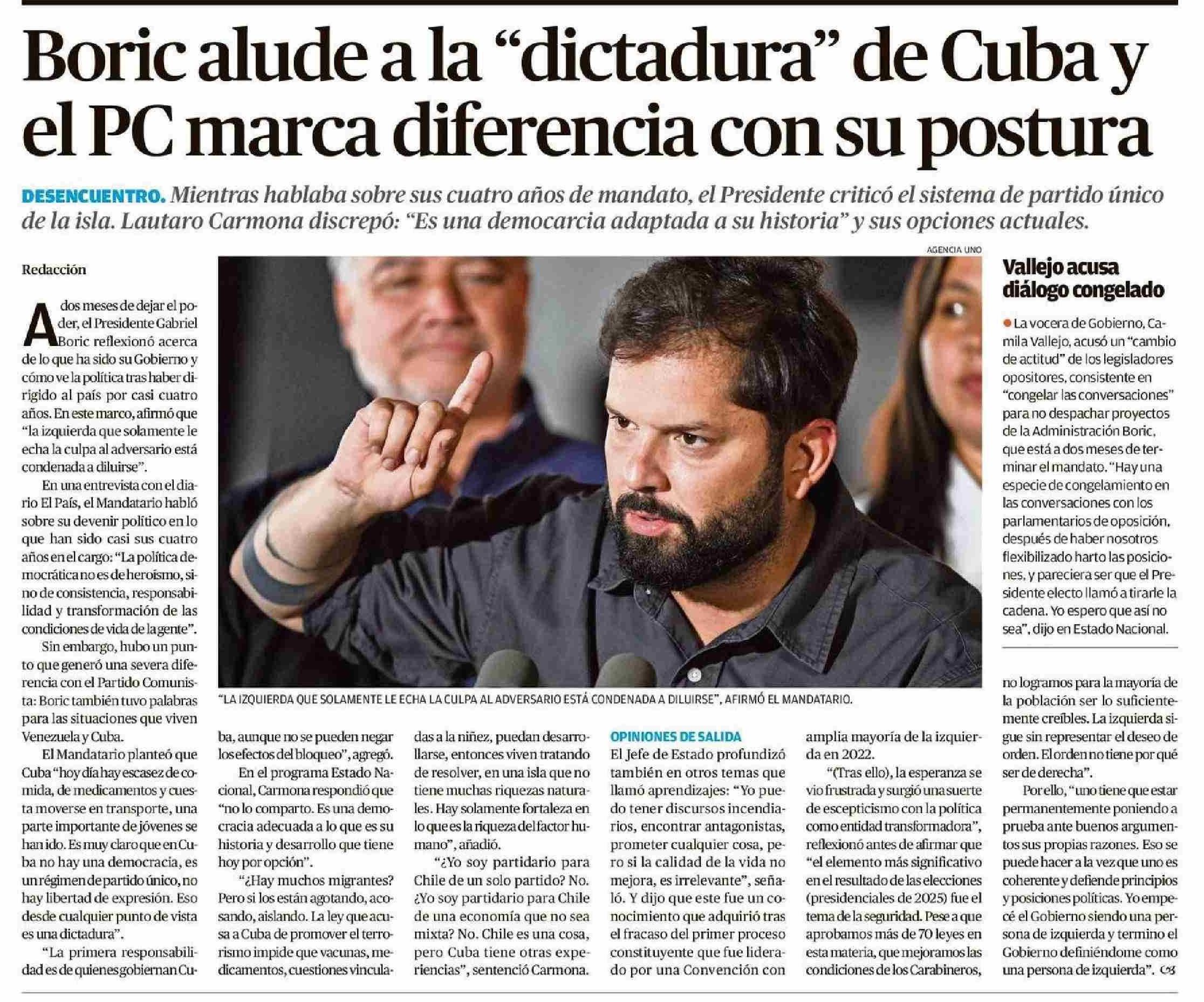 Boric alude a la "dictadura" de Cuba y el PC marca diferencia con su postura 12-01-2026 Diario Austral Región de Los Ríos |