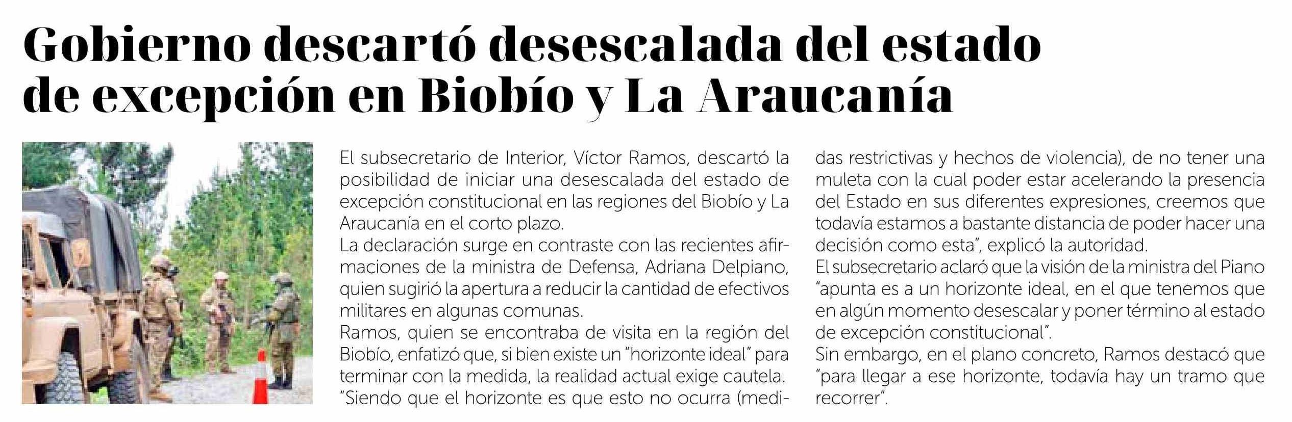 Título: Gobierno descartó desescalada del estado de excepción en Biobío y La Araucanía