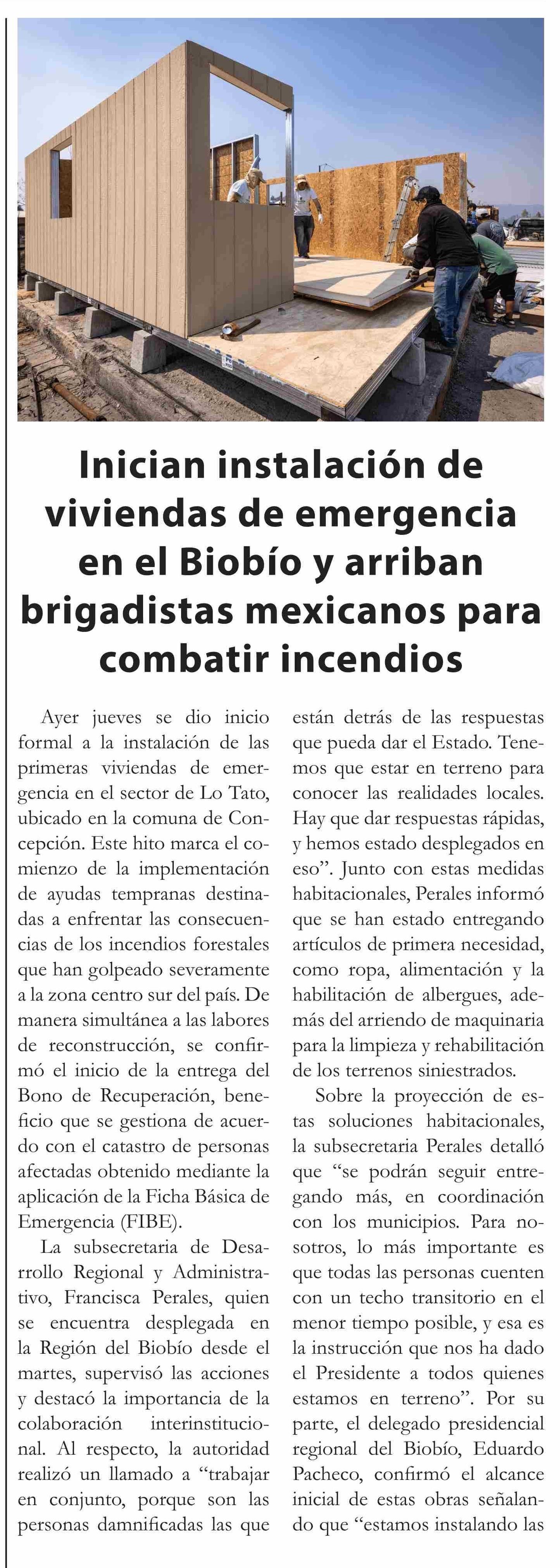 Título: Inician instalación de viviendas de emergencia en el Biobío y arriban brigadistas mexicanos para combatir incendios