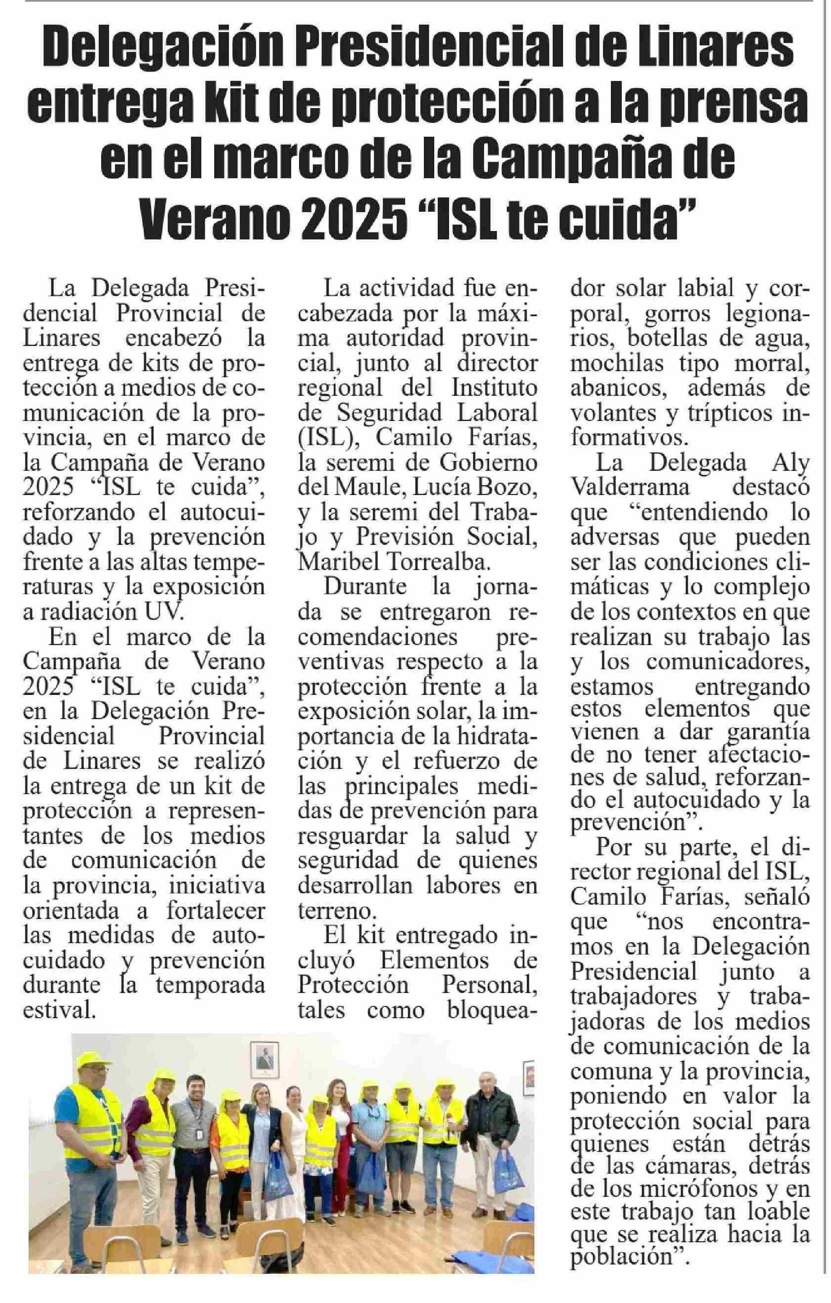 Delegación Presidencial de Linares entrega kit de protección a la prensa en el marco de la Campaña de Verano 2025 "ISL te cuida" 22-01-2026 El Heraldo |