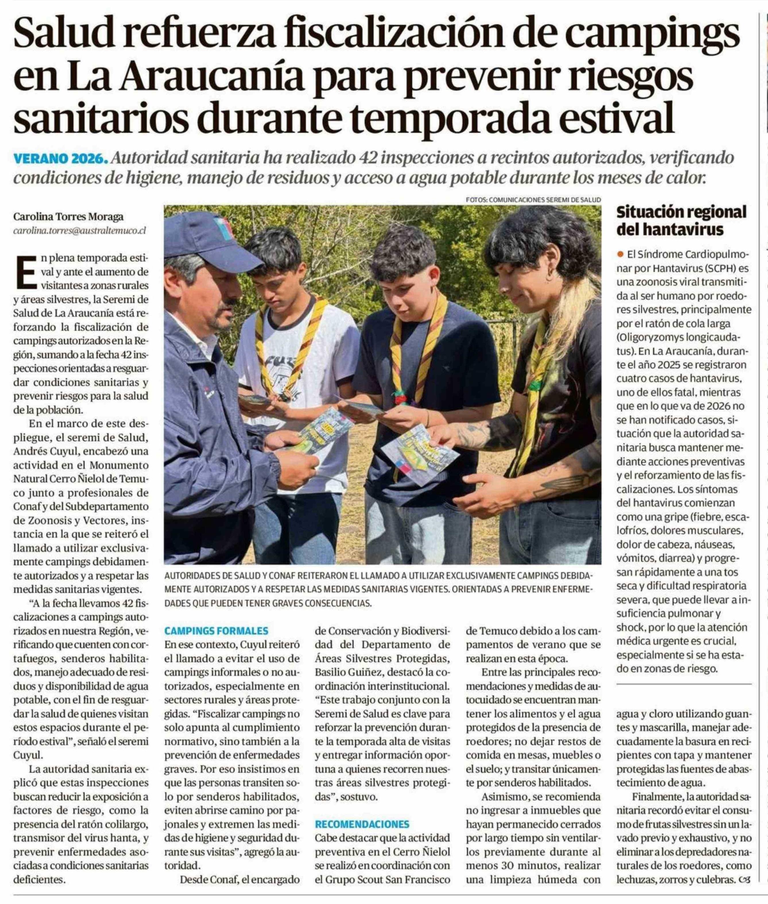 Salud refuerza fiscalización de campings en La Araucanía para prevenir riesgos sanitarios durante temporada estival 21-01-2026 El Austral de la Araucanía |