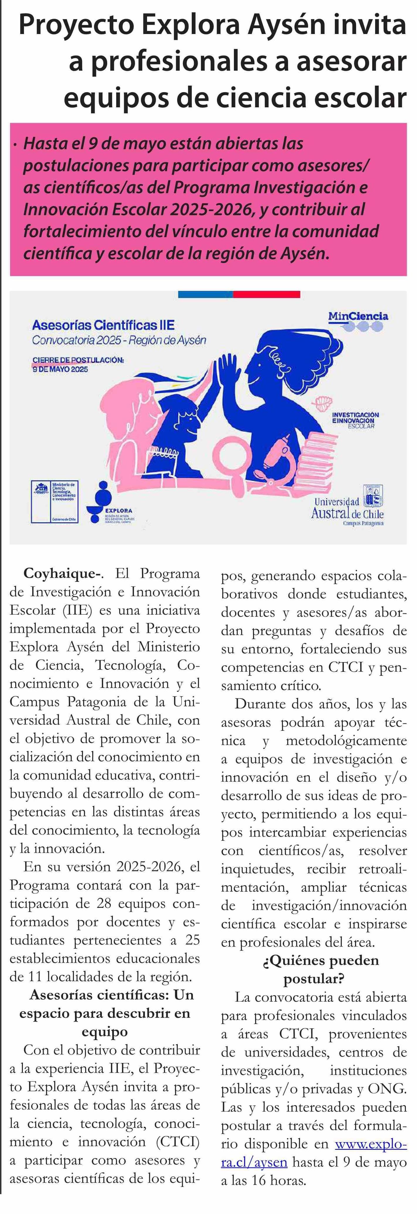 | Título: | Proyecto Explora Aysén invita a profesionales a asesorar equipos de ciencia escolar |