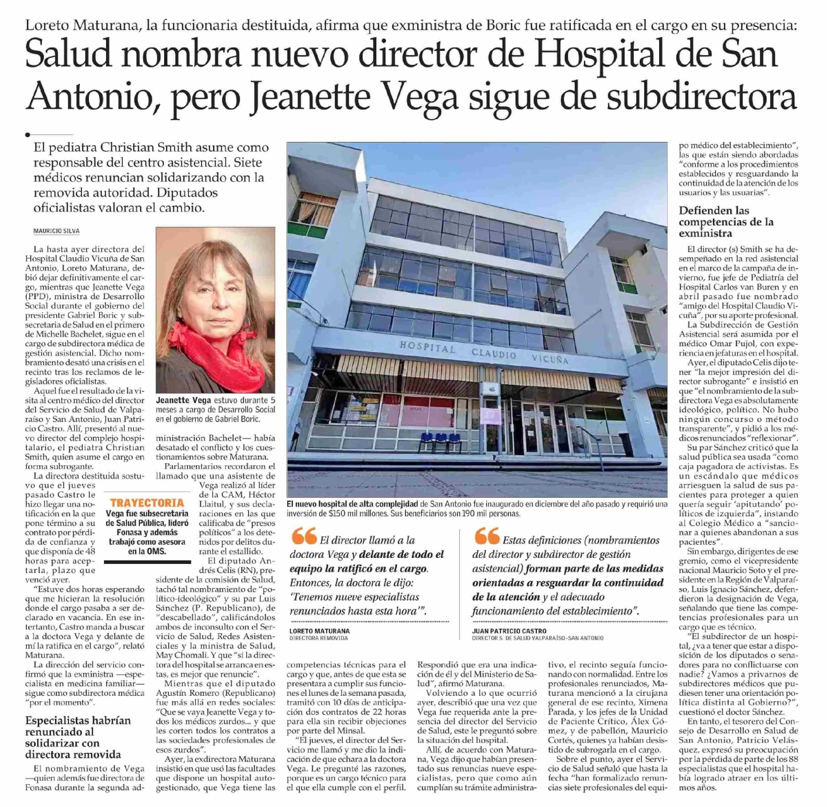 Salud nombra nuevo director de Hospital de San Antonio, pero Jeanette Vega sigue de subdirectora 28-04-2026 El Mercurio |