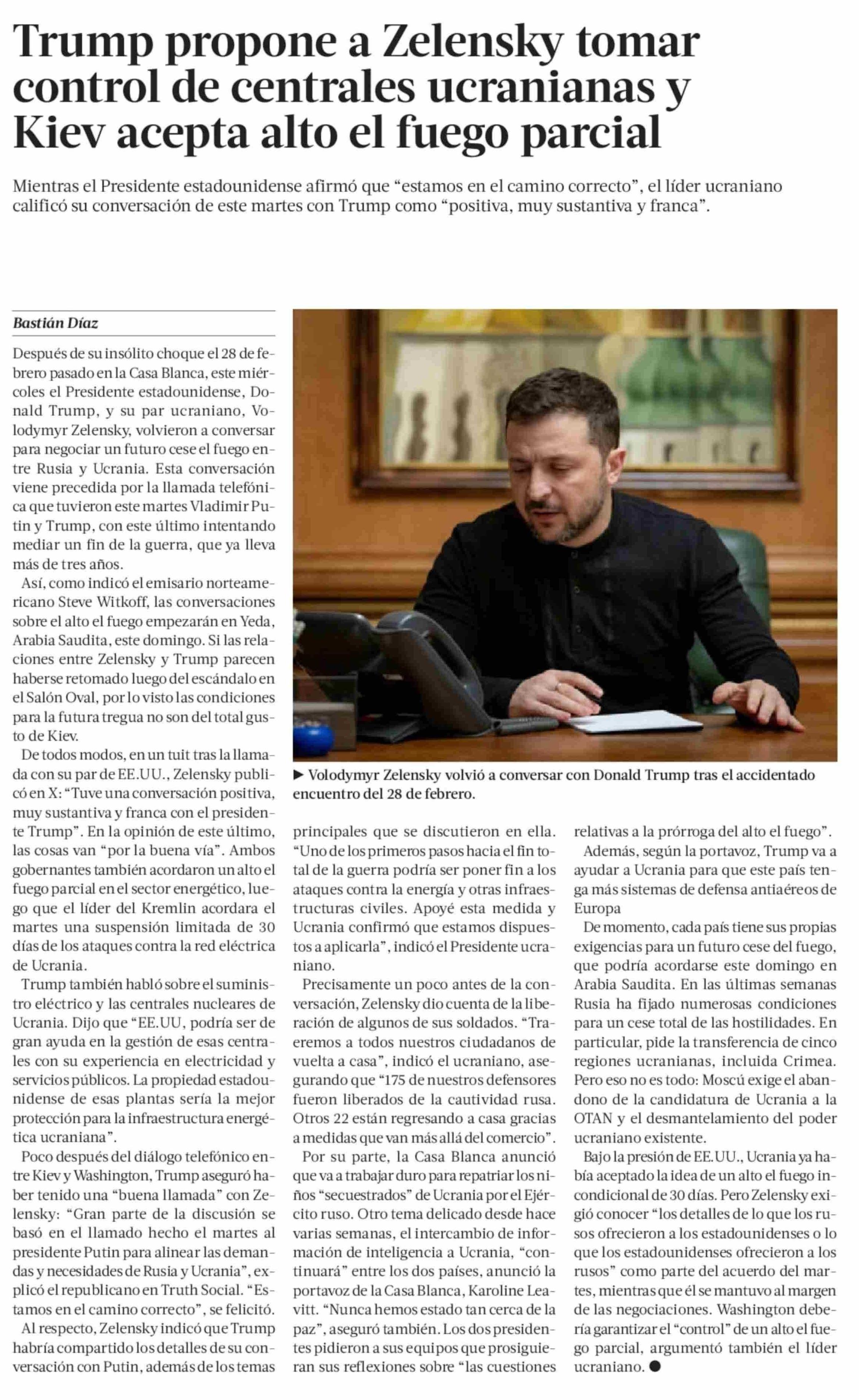 Trump propone a Zelensky tomar control de centrales ucranianas y Kiev acepta alto el fuego parcial 20-03-2025 La Tercera |